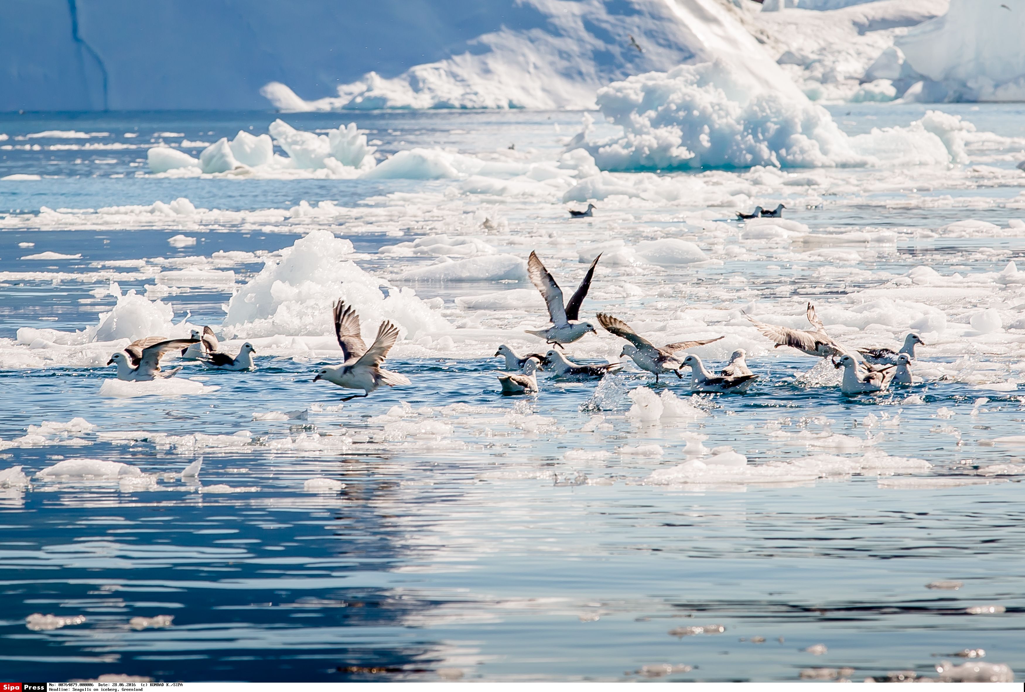 File photo shows seagulls playing in the cold water between the iceberg in the disko bay, opposite the town of Ilulissat, Greenland.(SIPA/Handout via Xinhua)
