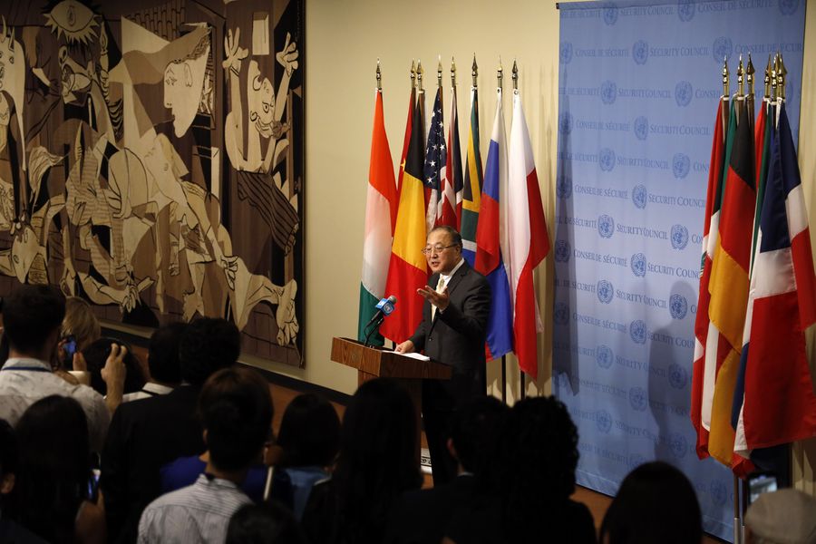 Zhang Jun, Chinese Permanent Representative to the United Nations, speaks to the press on the situation in Jammu and Kashmir, at the UN headquarters in New York, on Aug. 16, 2019. (Xinhua/Li Muzi)