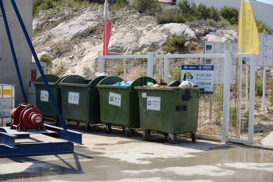 The sorting dustbins at the construction site of the Peljesac Bridge on the Peljesac Peninsula, Croatia. (Xinhua/Gao Lei)