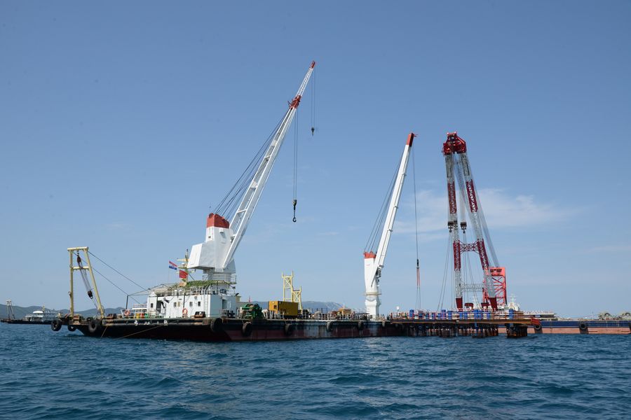 The construction site of the Peljesac Bridge near the Peljesac Peninsula, Croatia. (Xinhua/Gao Lei)