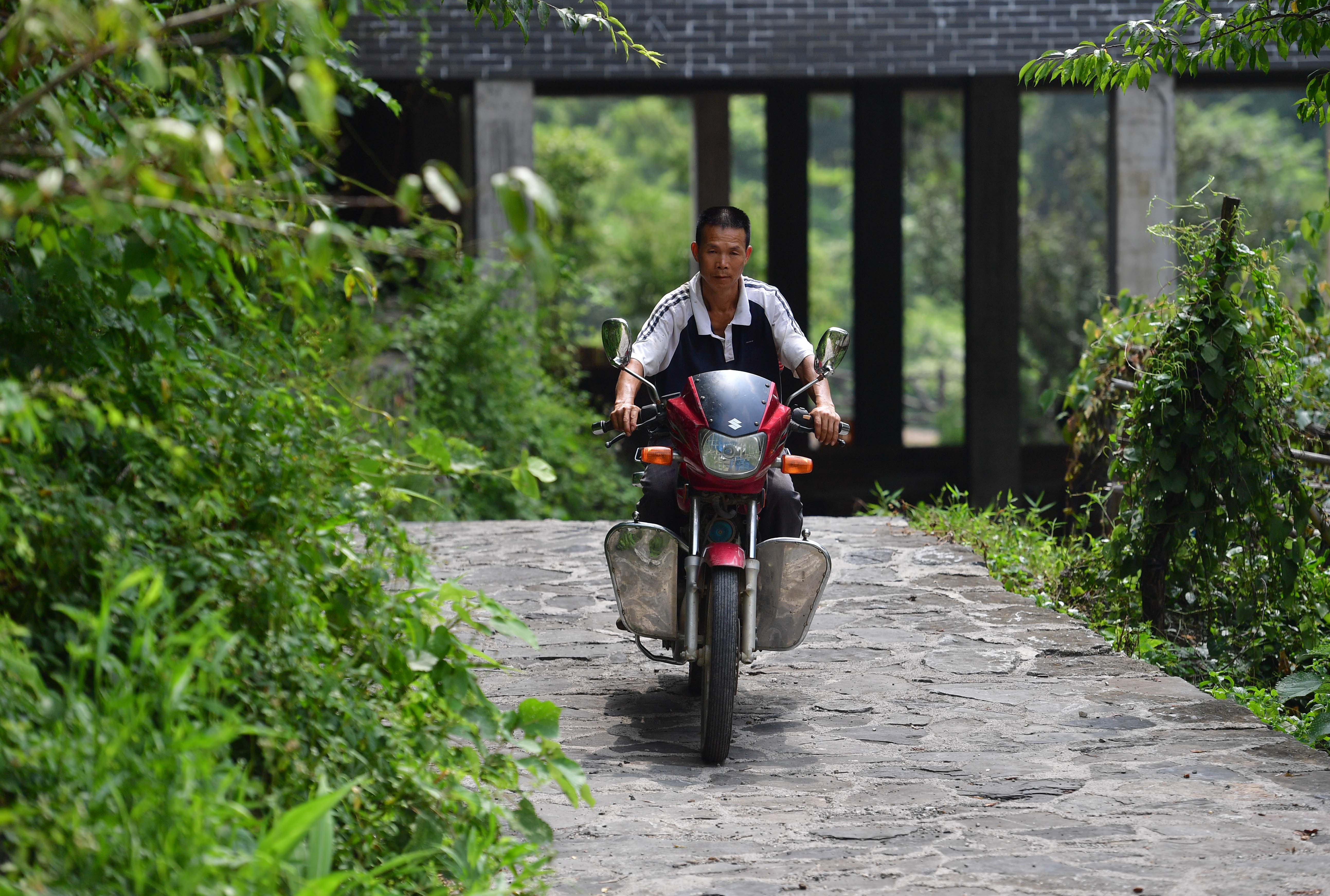 Long Gexiong rides a motorcycle for work at Tongbantun Village of Dongqi Township in Rongan County, south China's Guangxi Zhuang Autonomous Region. (Xinhua/Huang Xiaobang)