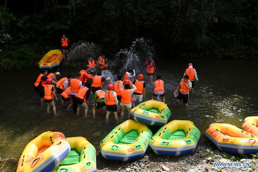 Tourists take a break while experiencing drifting at Ganjiangyuan National Nature Reserve in Ganjiangyuan Township of Shicheng County, east China's Jiangxi Province, Aug. 18, 2019. (Xinhua/Chen Yehua)