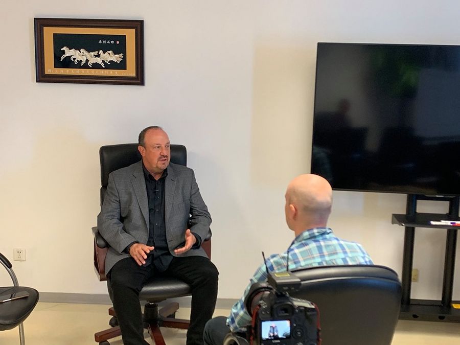 Rafael Benitez speaks with Xinhua reporter Michael Butterworth in an exclusive interview in Dalian, northeast China's Liaoning Province, on August 17, 2019. (Xinhua/Cao Jianjie)
