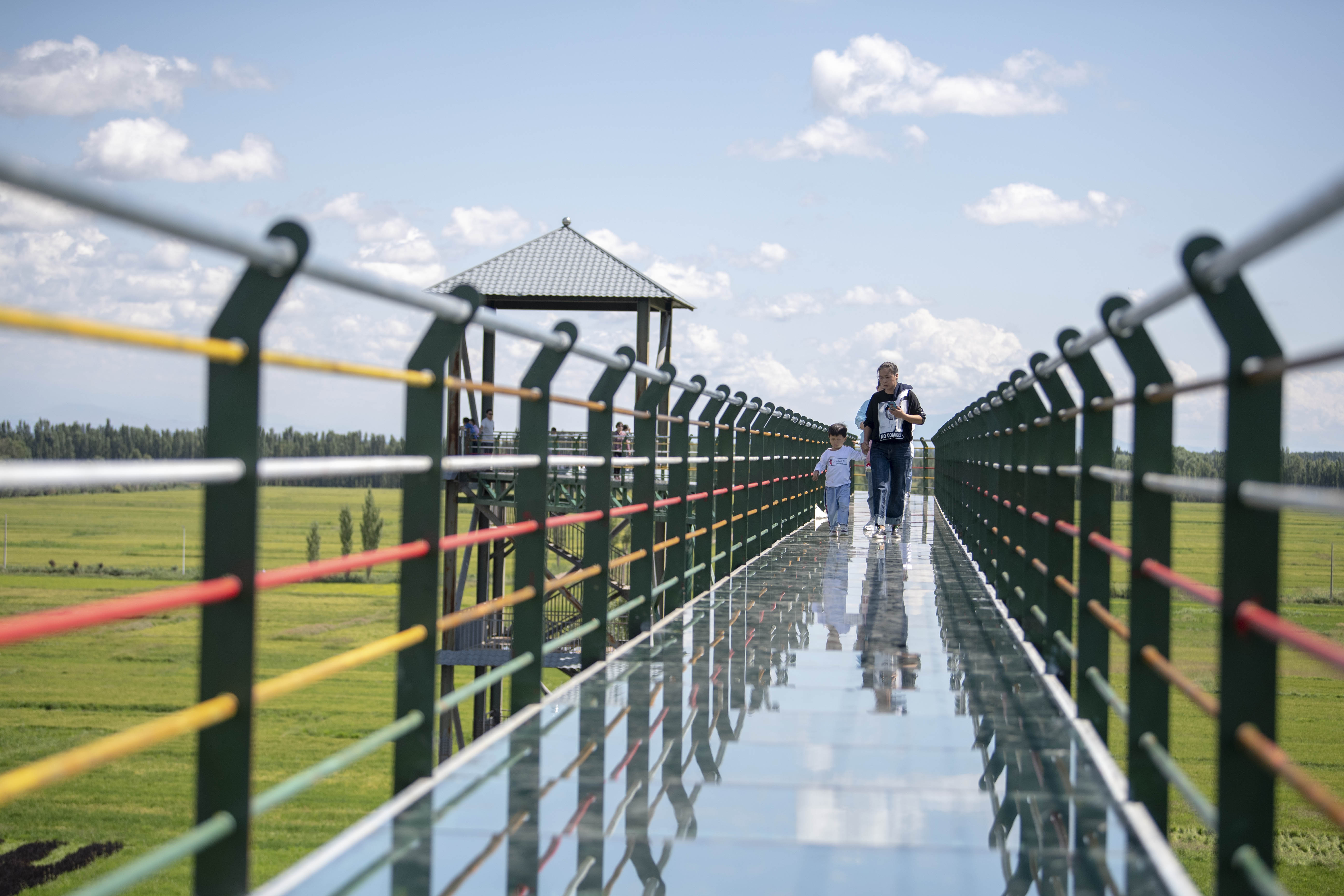 Tourists view rice fields on a glass skywalk in Nadaqiniru Township of Qapqal Xibe Autonomous County, northwest China's Xinjiang Uygur Autonomous Region, Aug. 18, 2019. (Xinhua/Sadat)