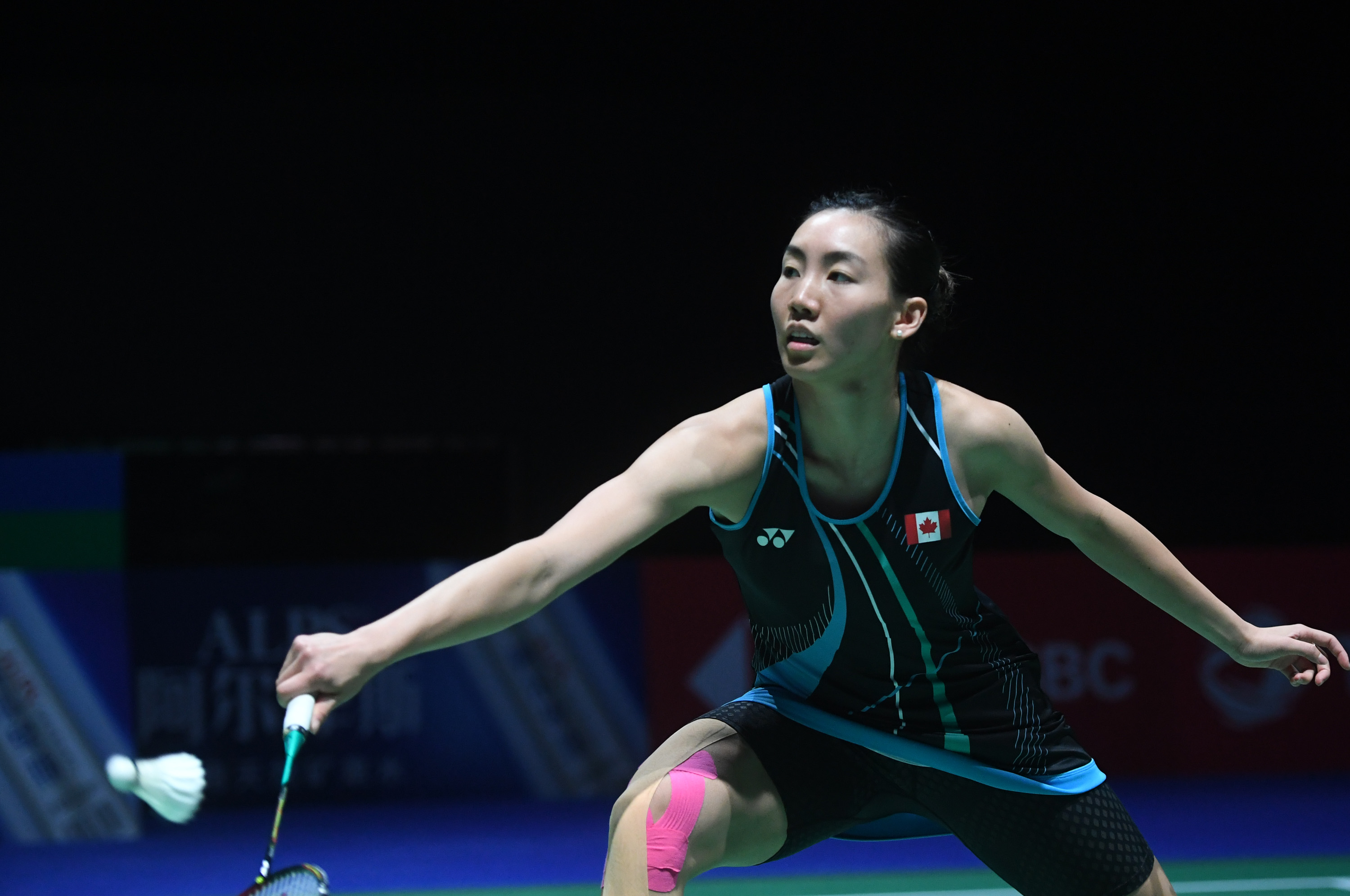 Michelle Li of Canada returns during her women's singles third round match against Chen Yufei of China at the BWF Badminton World Championships 2019 in Basel, Switzerland, Aug. 22, 2019. (Xinhua/Li Jundong)