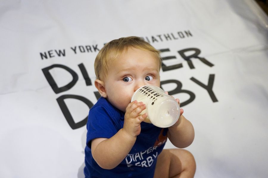 A baby (not related to this story) drinks milk during the Diaper Derby 2018 in New York, the United States, June 29, 2018. (Xinhua/Lin Bilin)