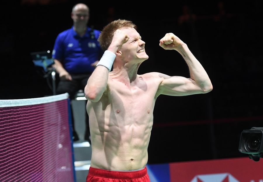Denmark's player Anders Antonsen celebrates after making last four at the 2019 Badminton World Championships in Basel, Switzerland on Aug. 24, 2019. (Xinhua/Li Jundong)