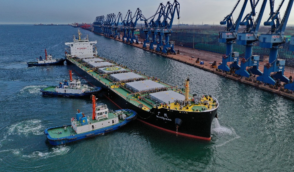 A ship berths at a wharf of Caofeidian port area in Tangshan, north China's Hebei Province, on Aug. 14, 2019. (Xinhua/Yang Shiyao)