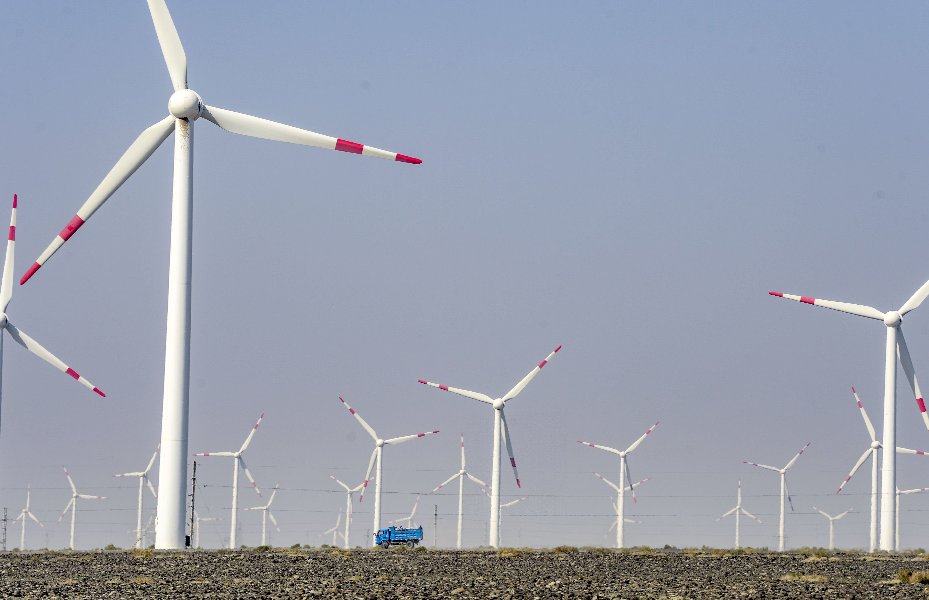 A vehicle runs across a wind power plant in Urumqi, northwest China's Xinjiang Uygur Autonomous Region, Sept. 18, 2018. (Xinhua/Zhao Ge)