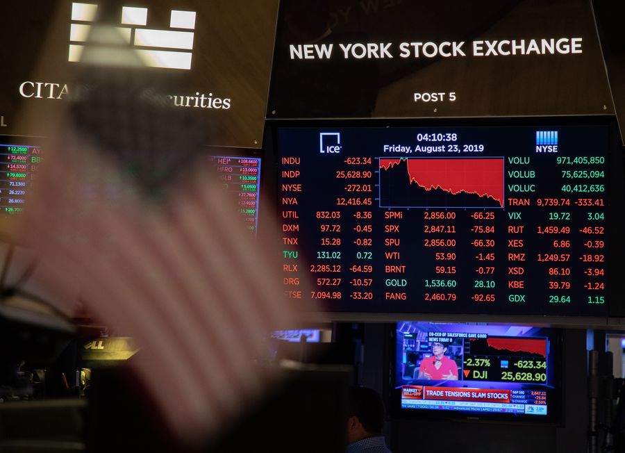 Trading information is seen on an electronic screen at the New York Stock Exchange in New York, the United States, on Aug. 23, 2019. U.S. Stocks closed sharply lower on Friday after China announced its countermeasures against U.S. tariffs. (Xinhua/Guo Peiran)