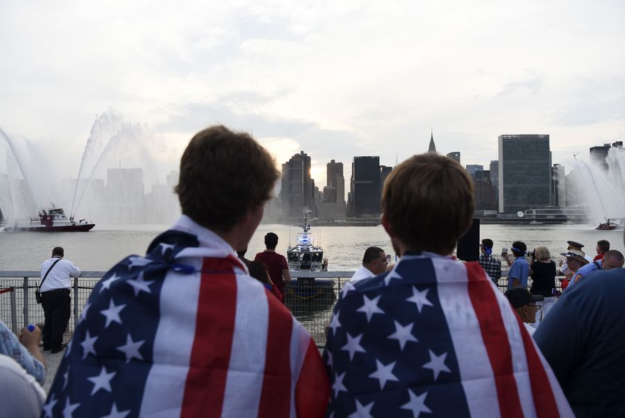 People watch the performance of the boat of the New York City Fire Department before the firework event to celebrate the Independence Day of the United States in New York July 4, 2018. (Xinhua/Han Fang)