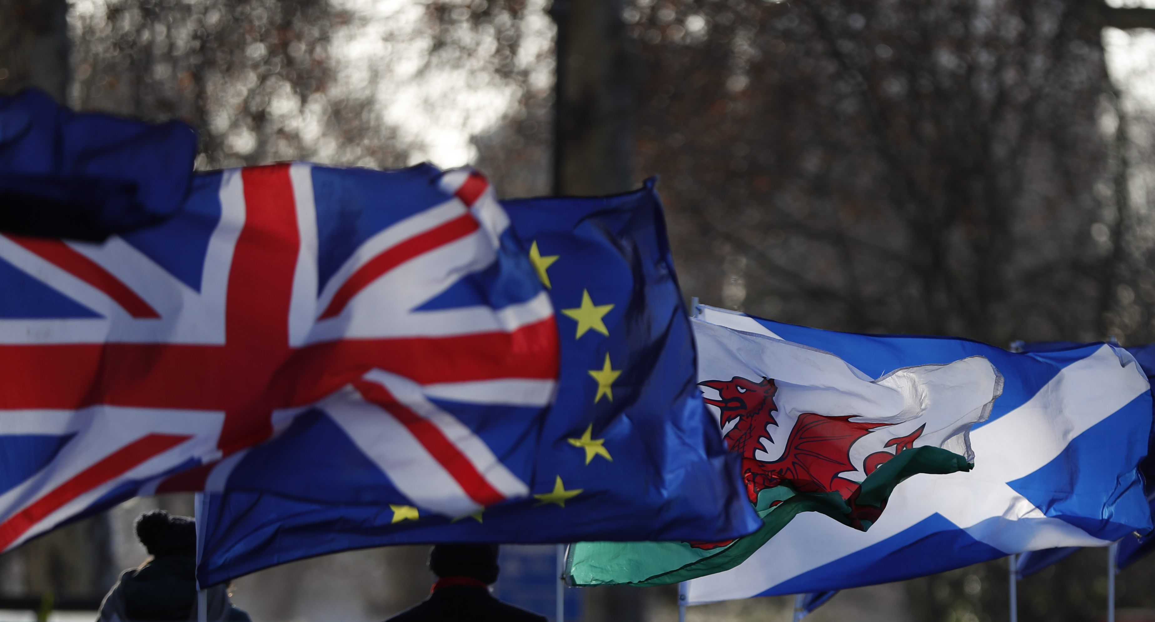 Photo taken on Jan. 22, 2019 shows the EU flags, UK flag (Union Jack flag), flag of Scotland and flag of Wales in central London, Britain.(Xinhua/Han Yan)
