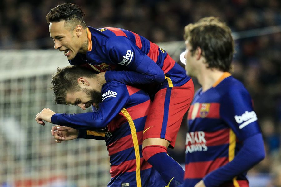 Gerard Pique (Bottom) celebrates after scoring with Neymar during the 2015-2016 Spanish La Liga when Barcelona host Sevilla on Feb. 28, 2016. Barcelona won 2-1. (Xinhua/Pau Barrena)