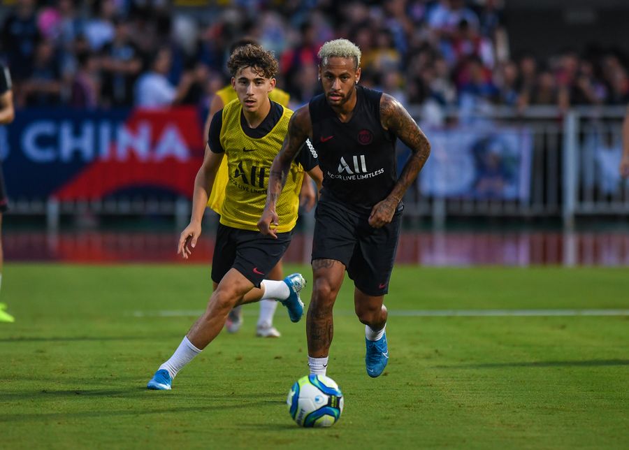 Neymar (R) came to China in August with Paris Saint-Germain. The photos shows that he attends a training session in Shenzhen of south China's Guangdong Province, on Aug. 1, 2019. (Xinhua/Mao Siqian)