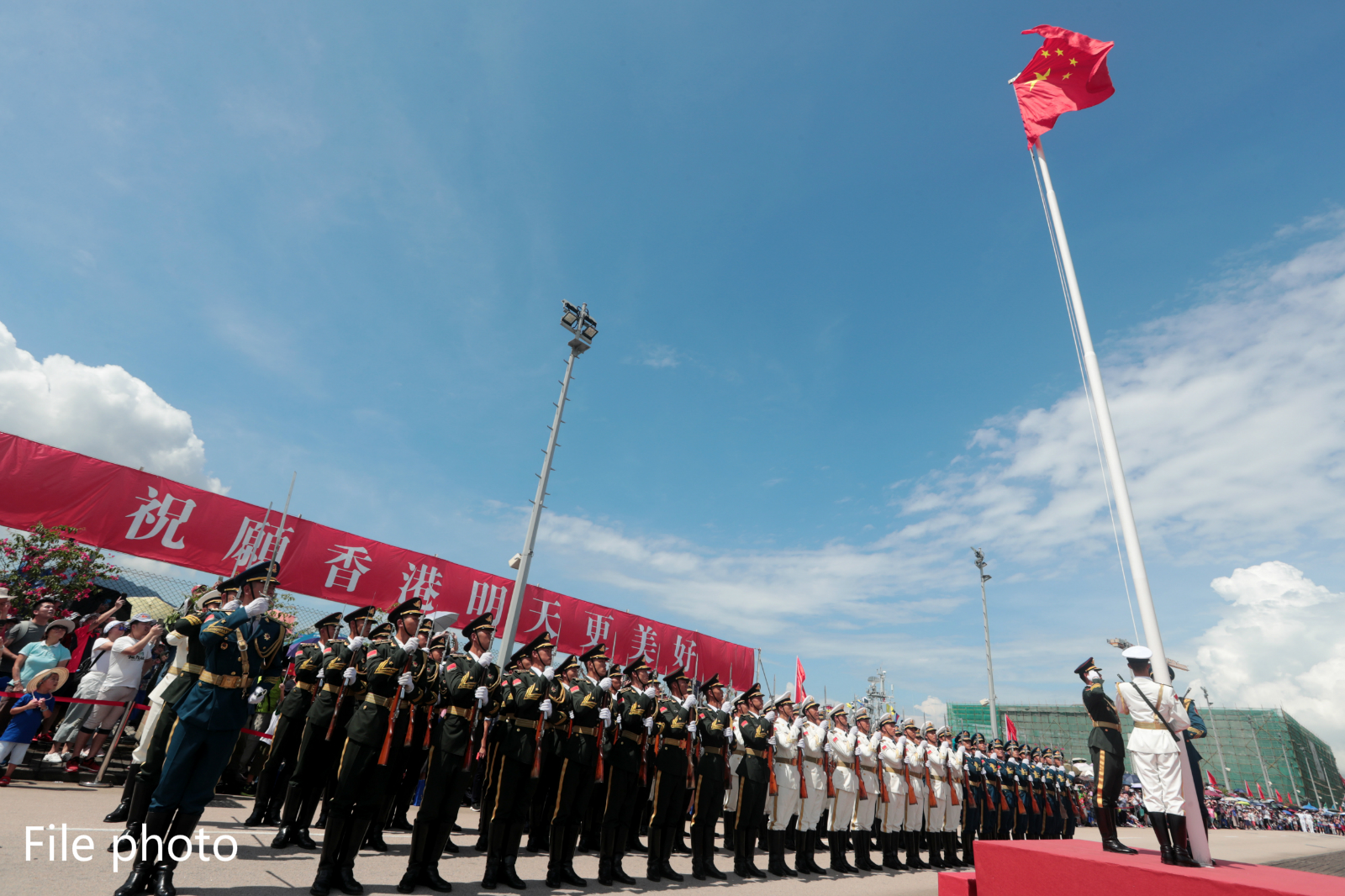 Chinese People's Liberation Army (PLA) Garrison in the Hong Kong Special Administrative Region (HKSAR) holds a flag raising ceremony at the Ngong Shuen Chau Barracks, June 30, 2019. (Xinhua/Yuan Junmin)