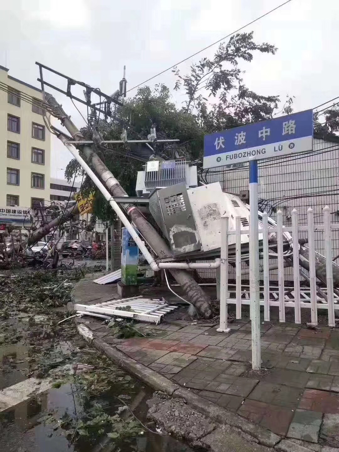 A car is crushed by a utility pole after a tornado ripped across Nada Township of Danzhou City, south China's Hainan Province, Aug. 29, 2019.(Xinhua)