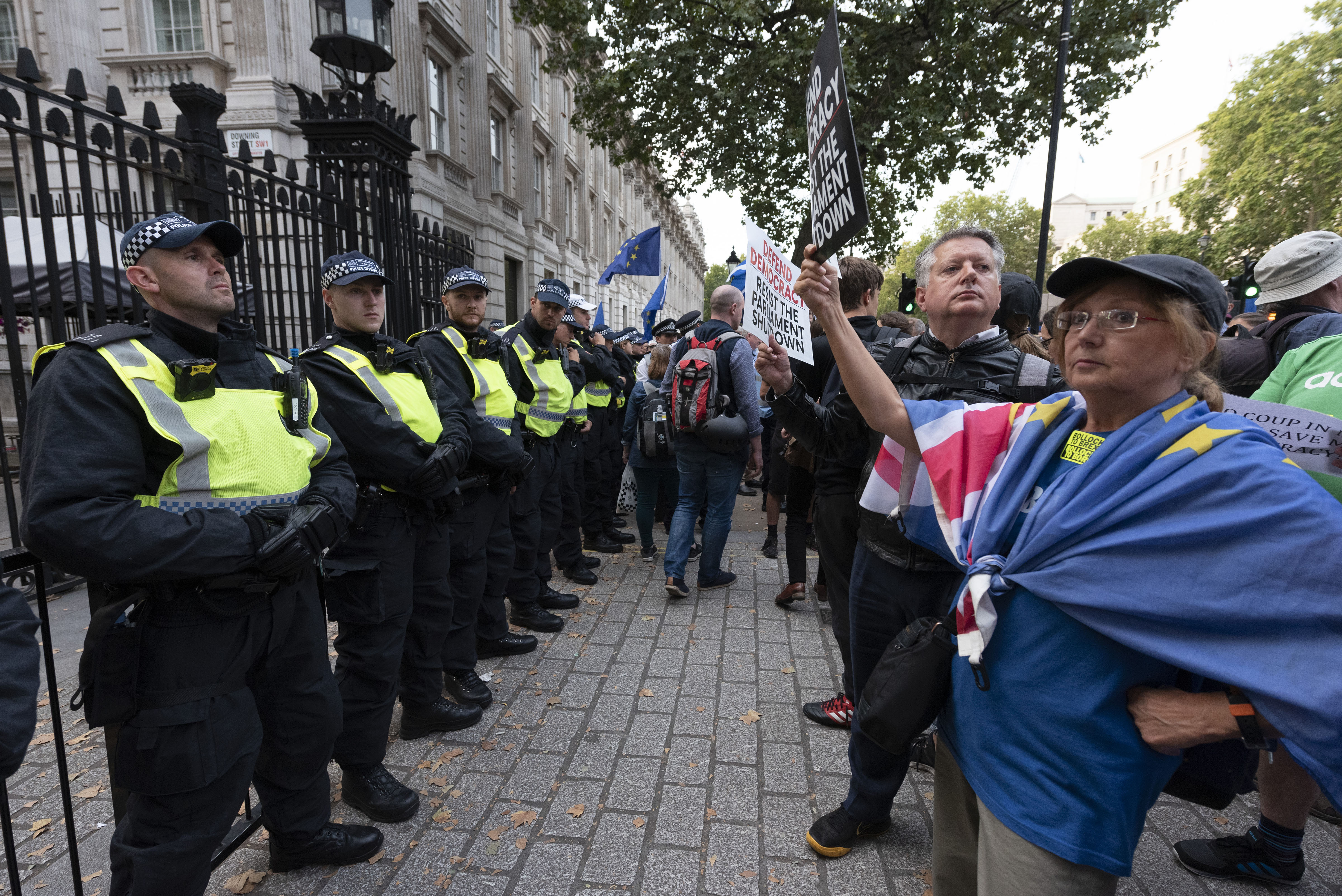 The campaign group, Another Europe is possible, organised a protest against the prorogation of parliament on College Green outside the Houses of Parliament. Some protestors marched along Whitehall to Downing Street.