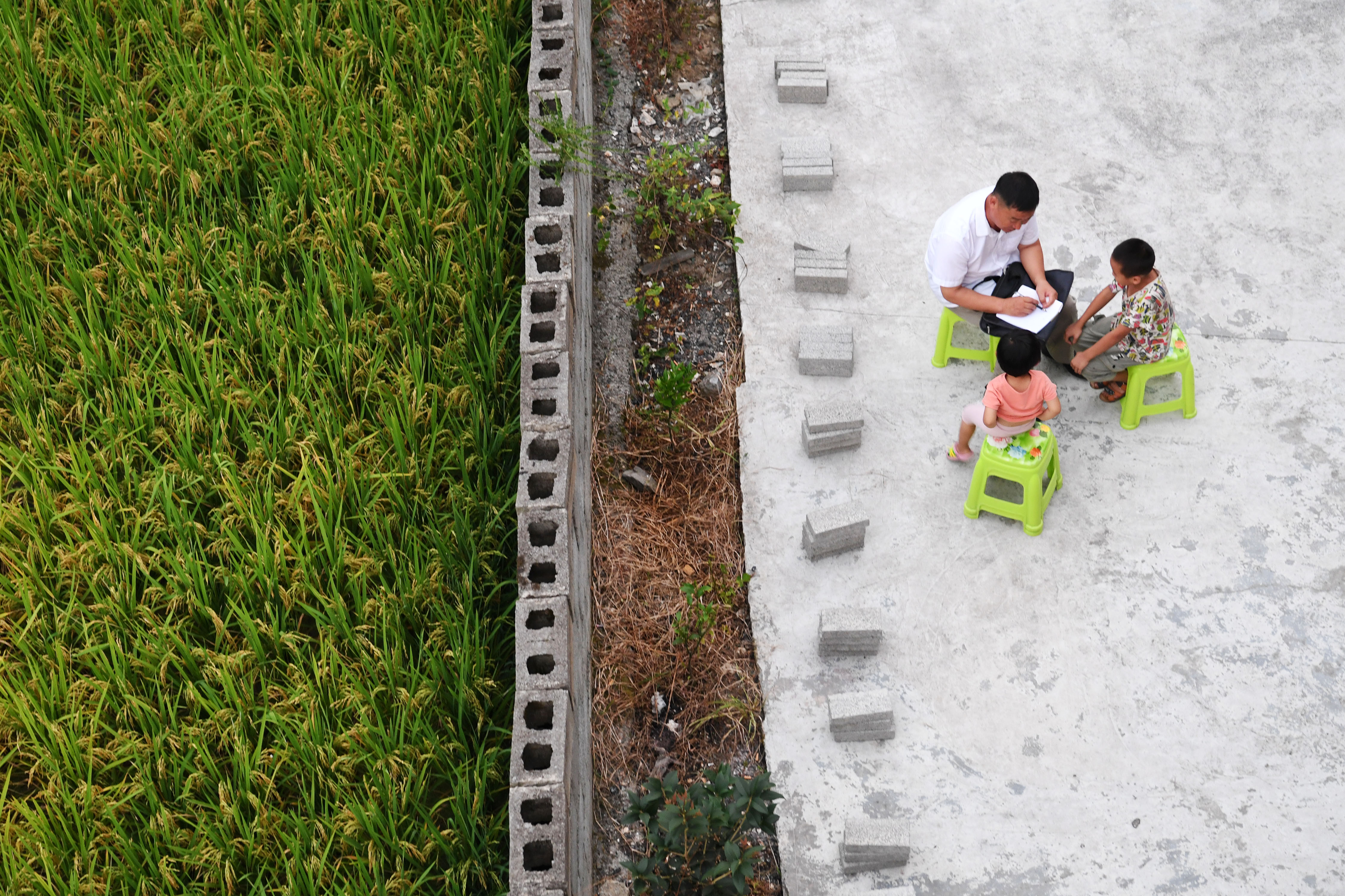 Wu Guoxian tutors students during a home visit at Liuguang Village of Longli County in Bouyei-Miao Autonomous Prefecture of Qiannan, southwest China's Guizhou Province, Aug. 26, 2019.(Xinhua/Yang Wenbin)