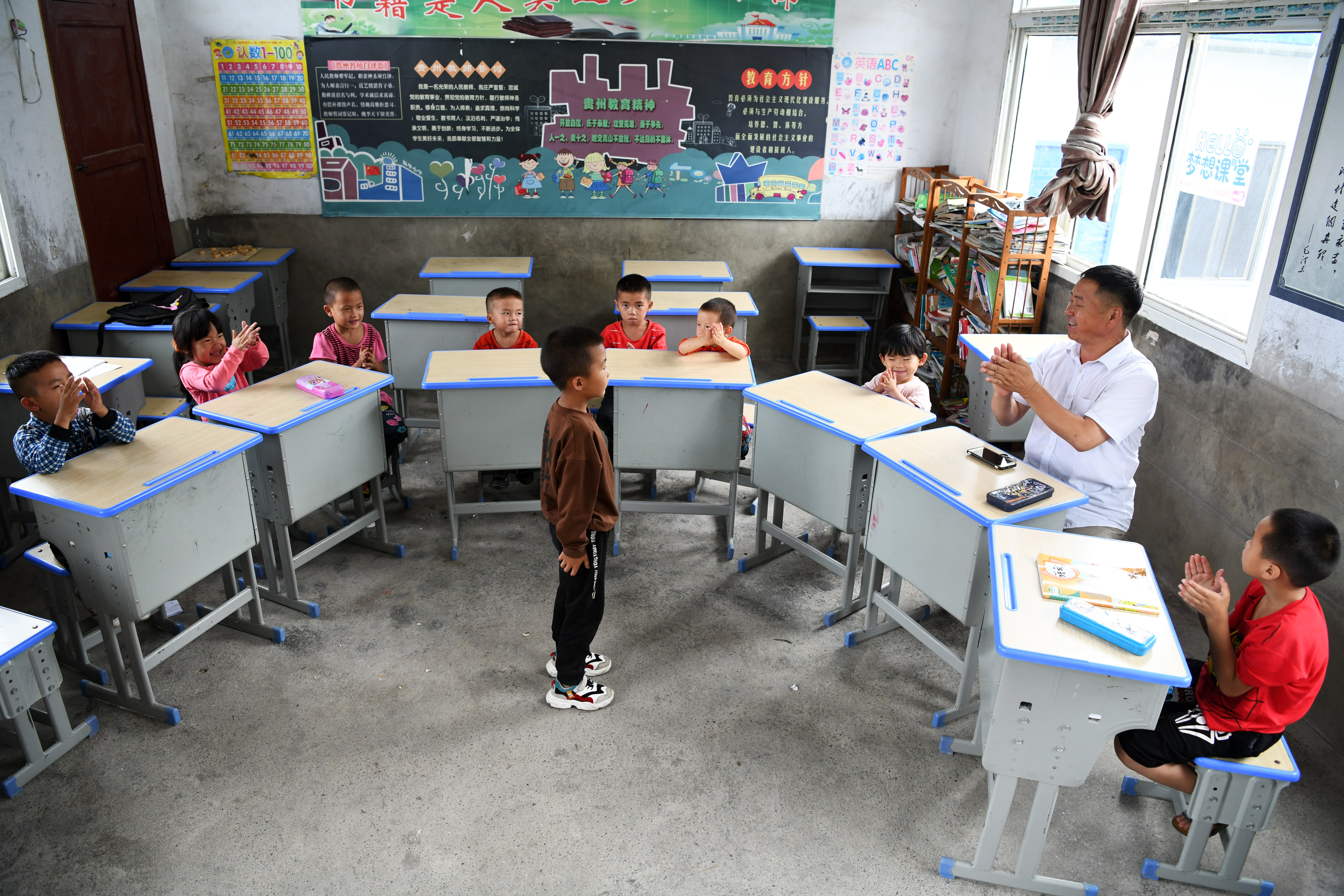Wu Guoxian gives a lesson to students at Gugang Primary School in Liuguang Village of Longli County in Bouyei-Miao Autonomous Prefecture of Qiannan, southwest China's Guizhou Province, Aug. 27, 2019.(Xinhua/Yang Wenbin)