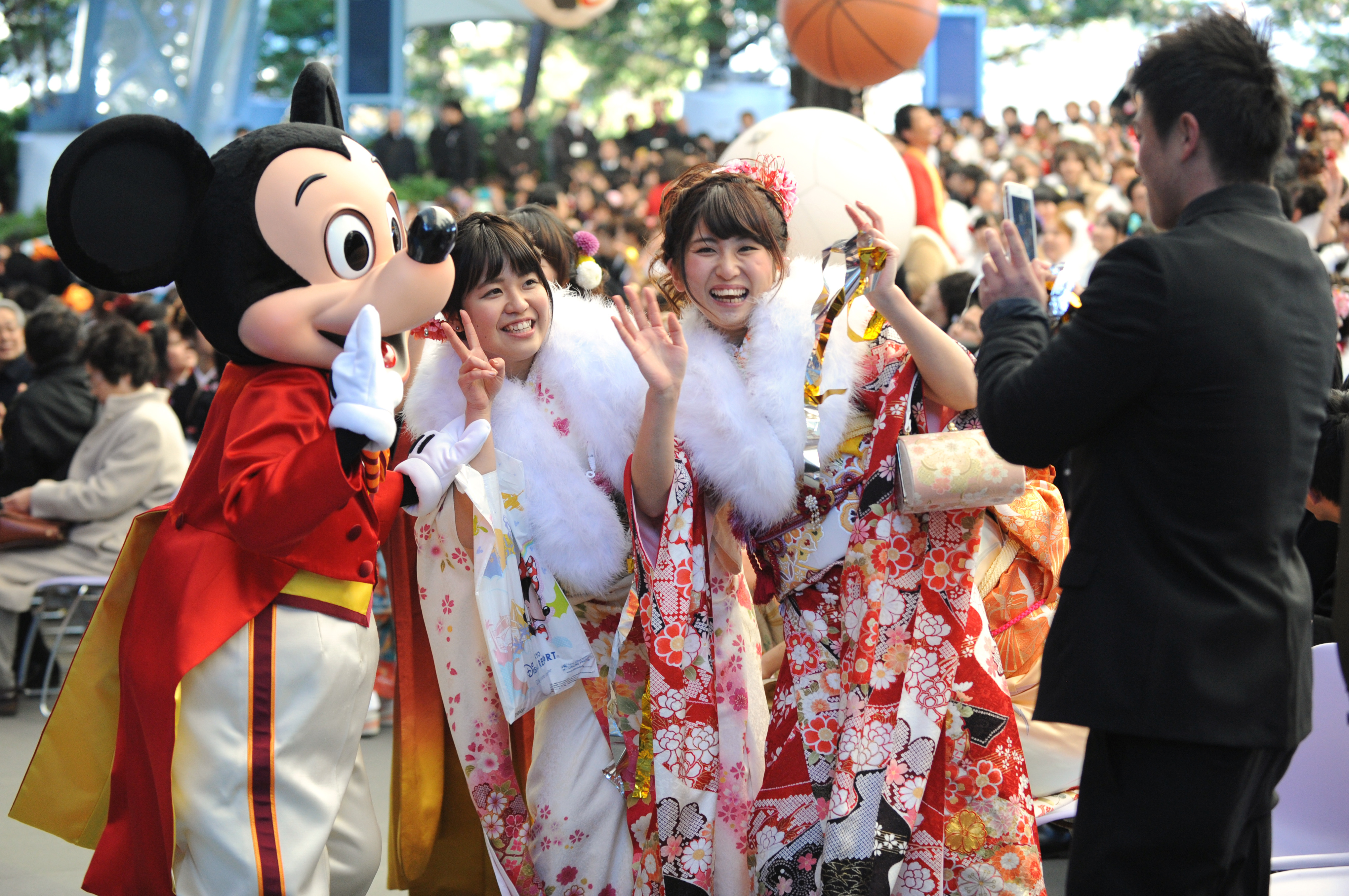 Young girls dressed in traditional kimonos attend the annual Coming-of-Age Day ceremony at the Tokyo Disneyland in Urayasu, suburban Tokyo, Japan, Jan. 12, 2015. (Xinhua/Stringer)