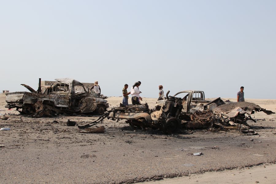 Local peopel check cars destroyed by airstrikes on the outskirts of Aden, Yemen, on Aug. 30, 2019. (Xinhua/Murad Abdo)