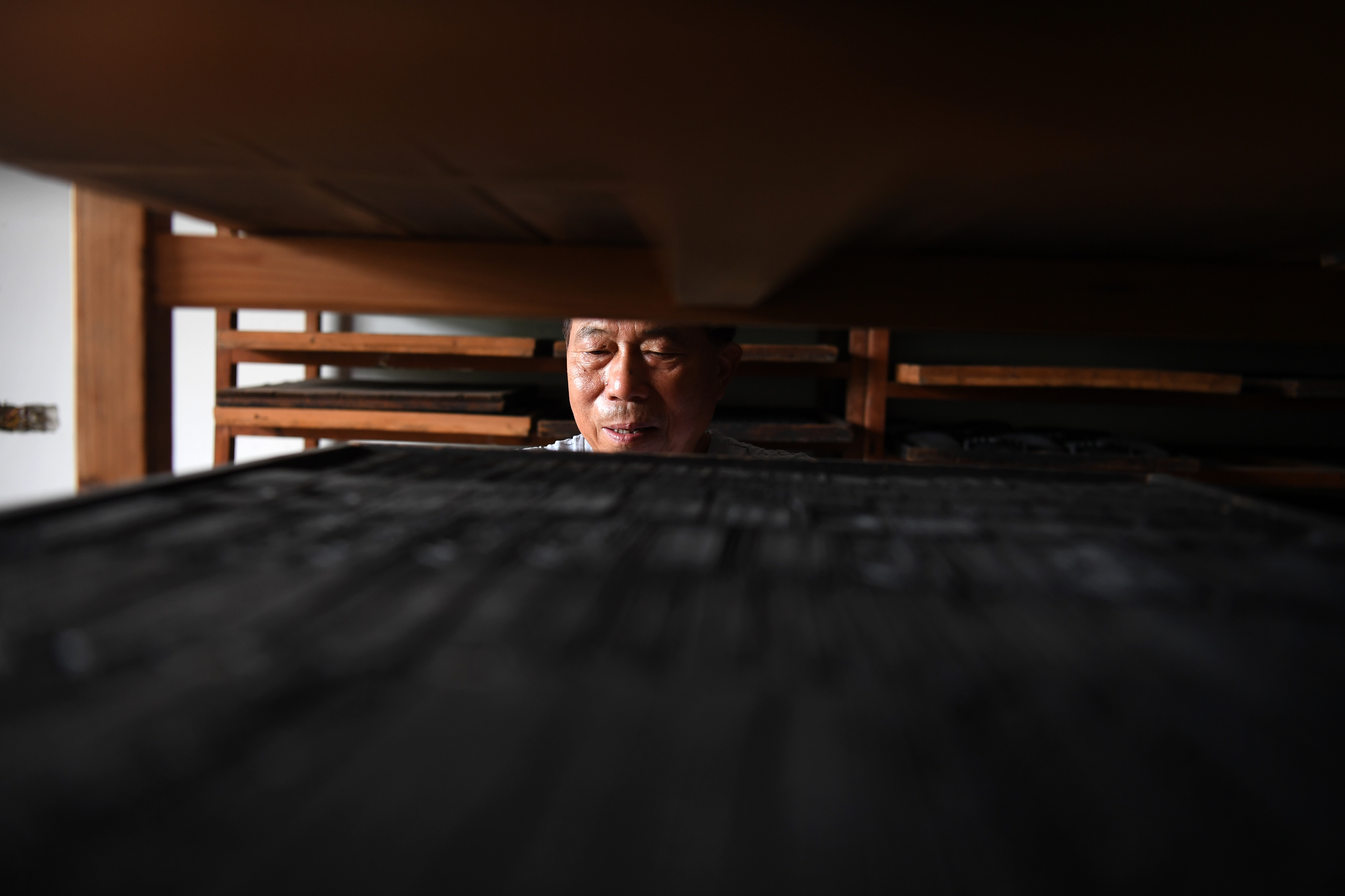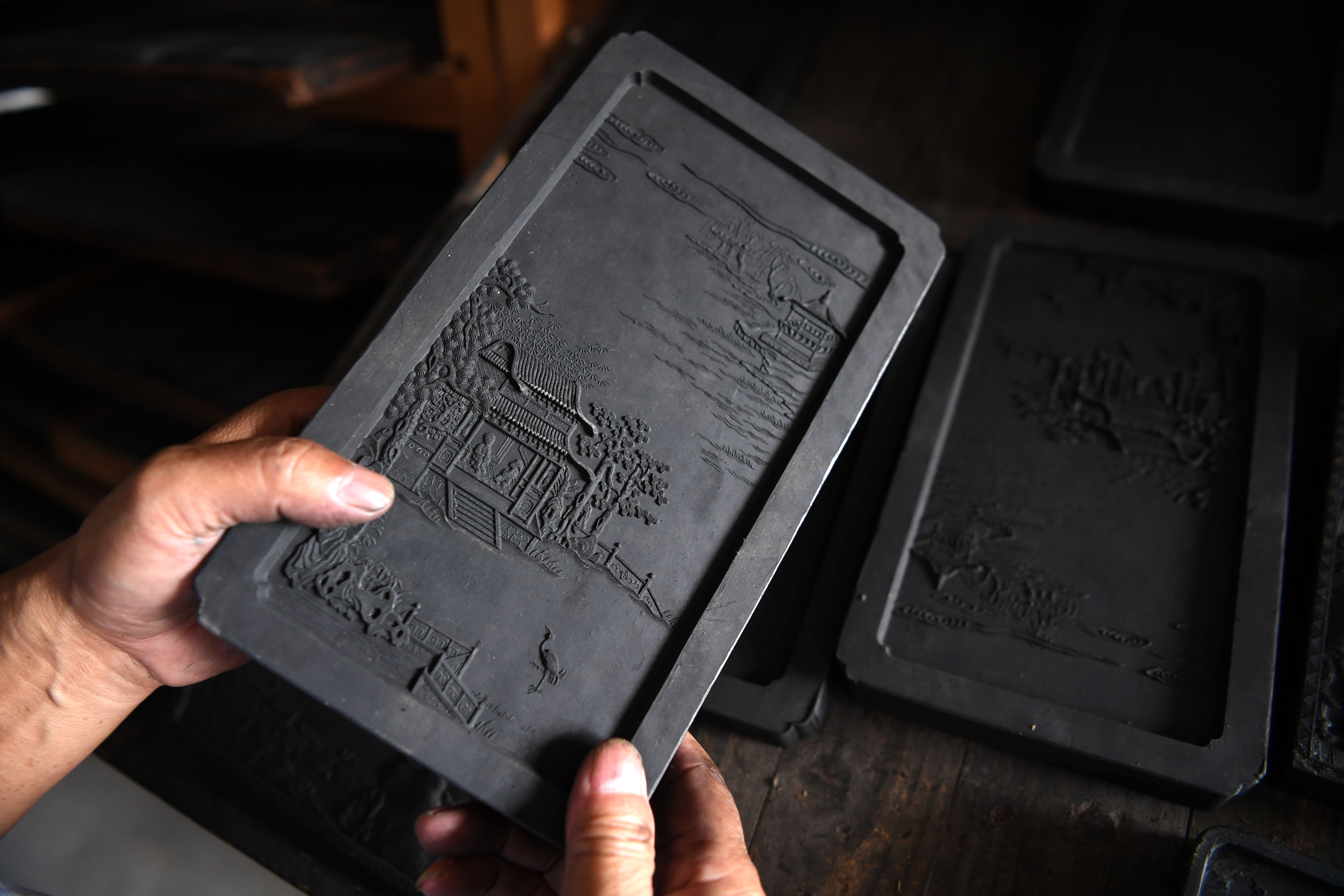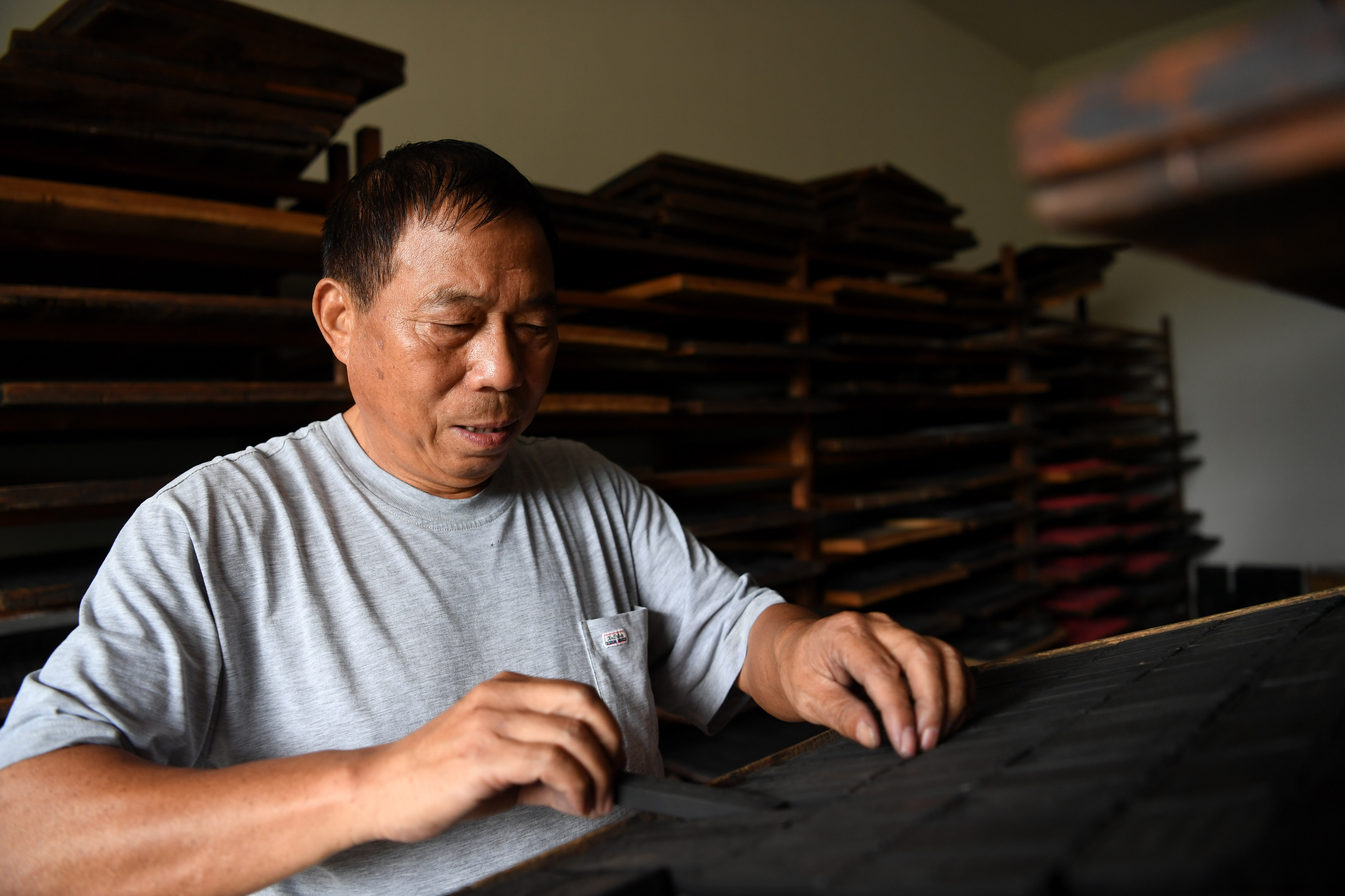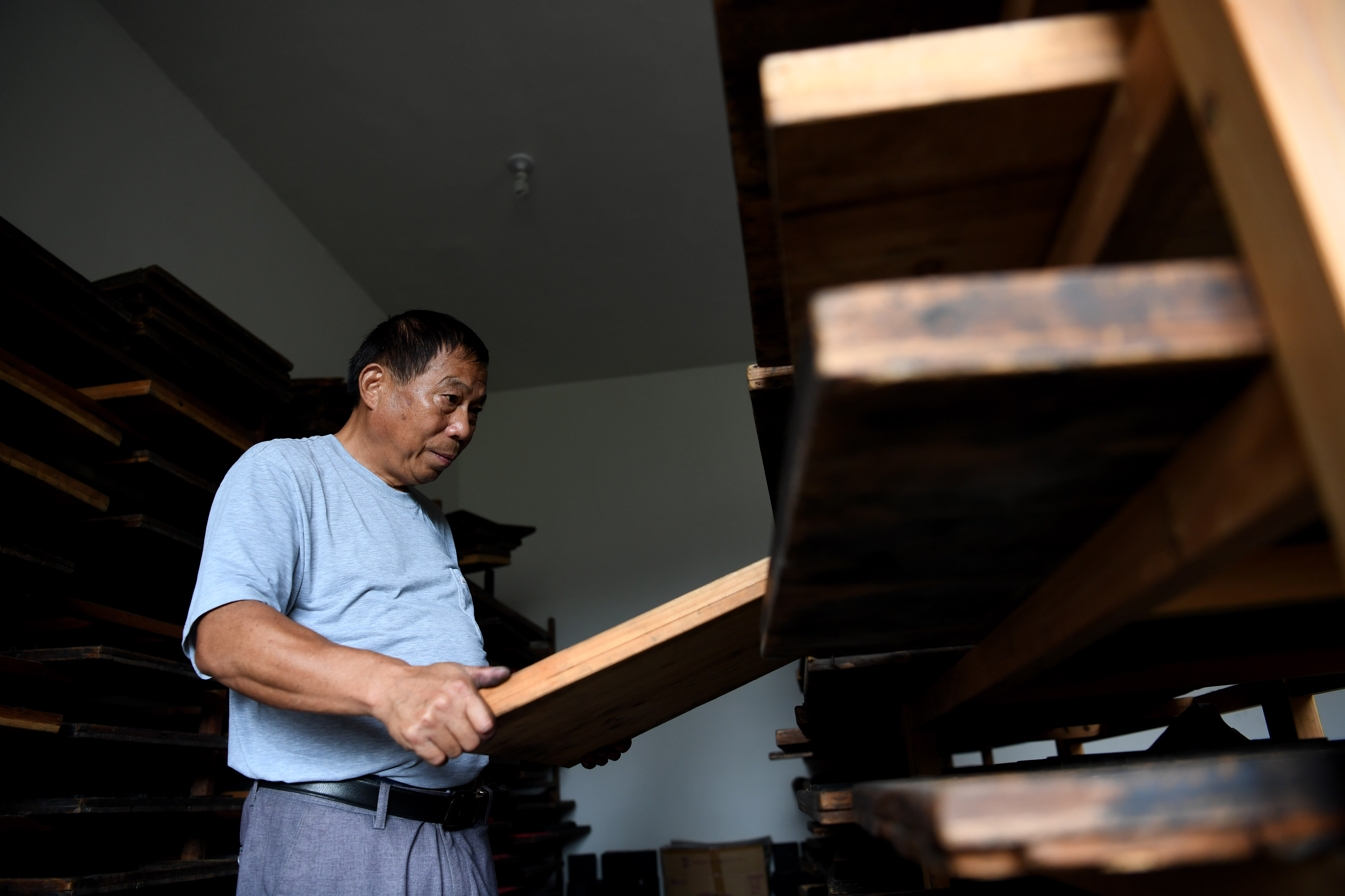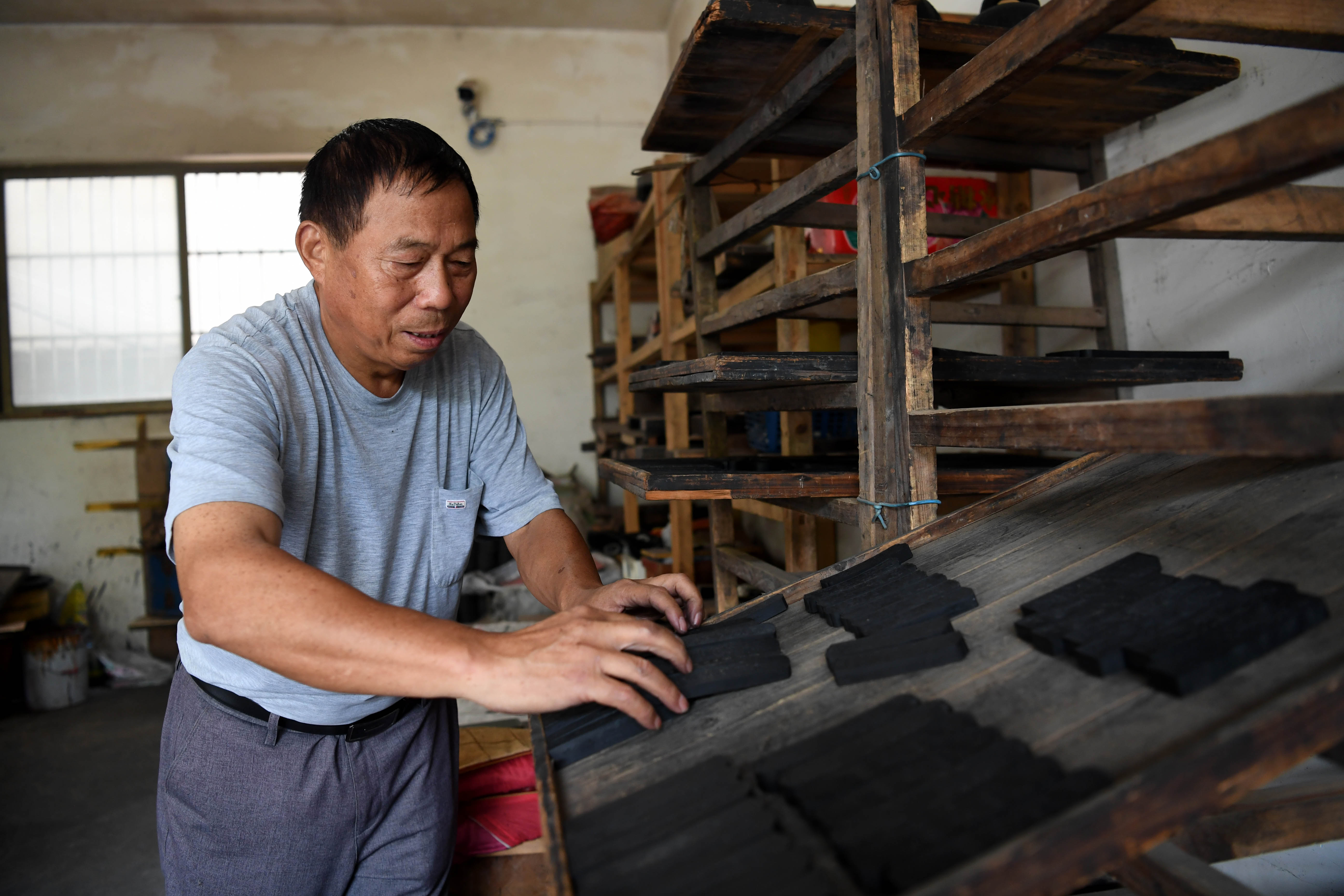 Wu Chenglin arranges ink moulds in the Huizhou District of Huangshan, east China's Anhui Province, Aug. 29, 2019.(Xinhua/Liu Junxi)