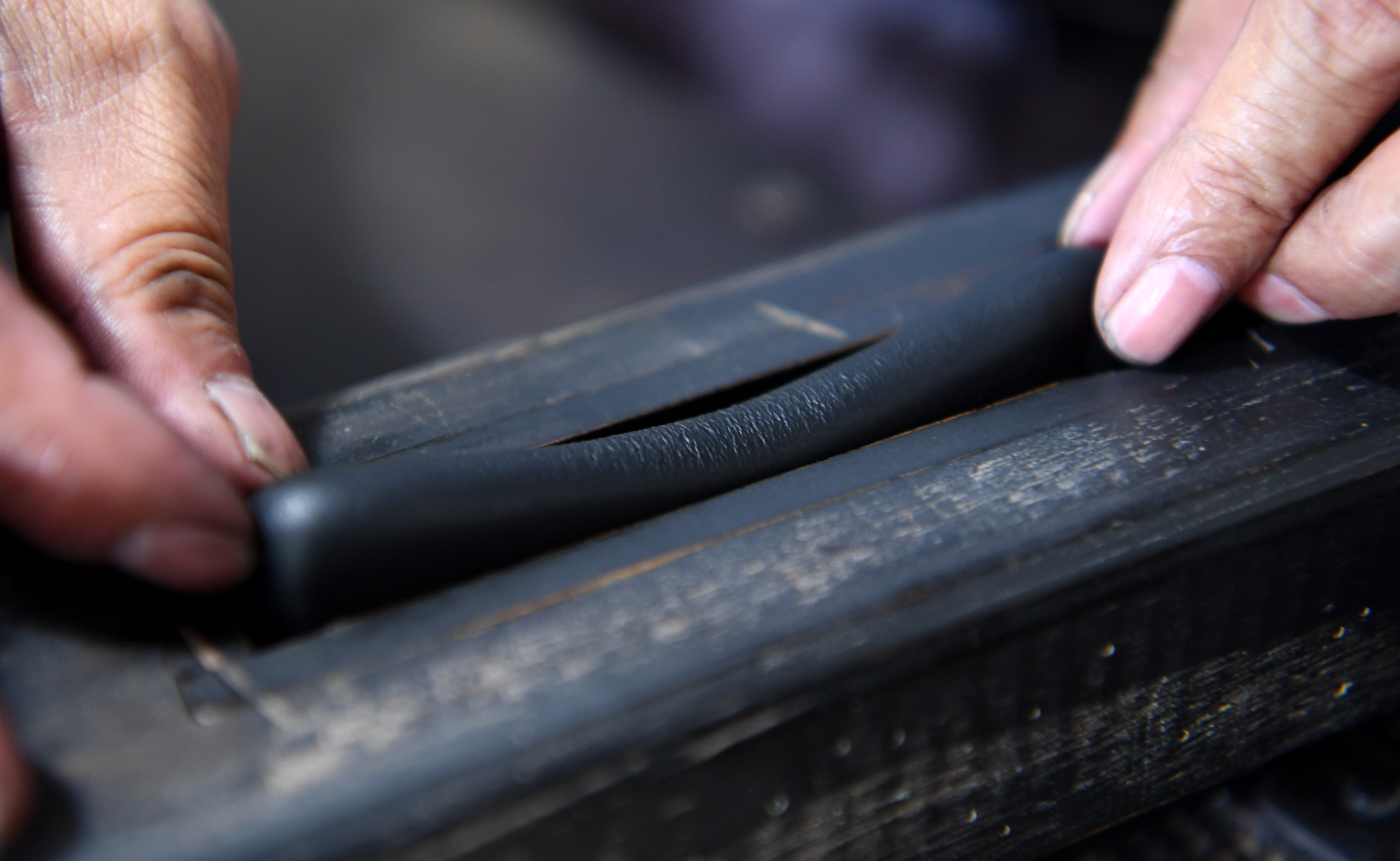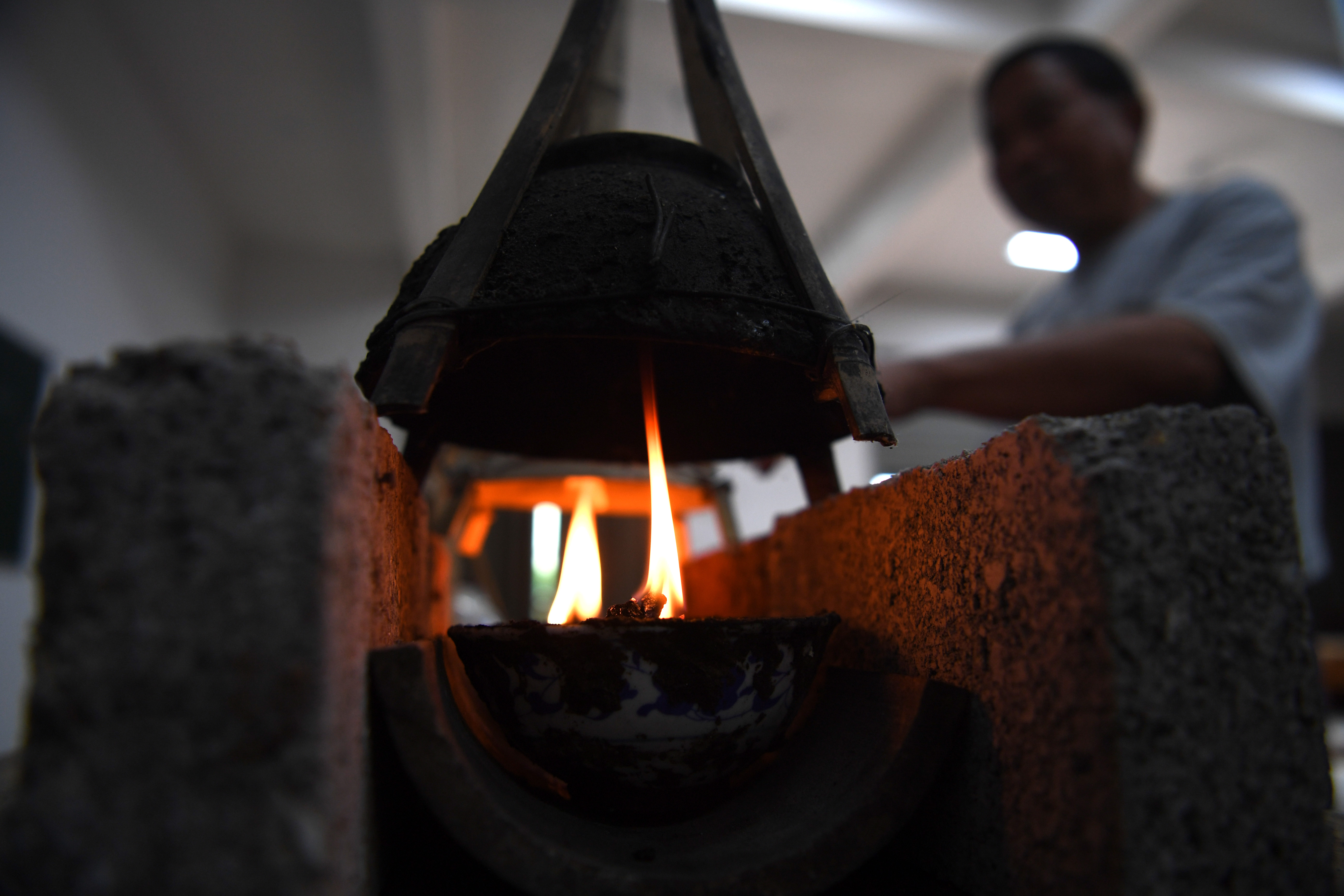 Wu Chenglin puts ink materials into an ink mould in the Huizhou District of Huangshan, east China's Anhui Province, Aug. 29, 2019. (Xinhua/Liu Junxi)