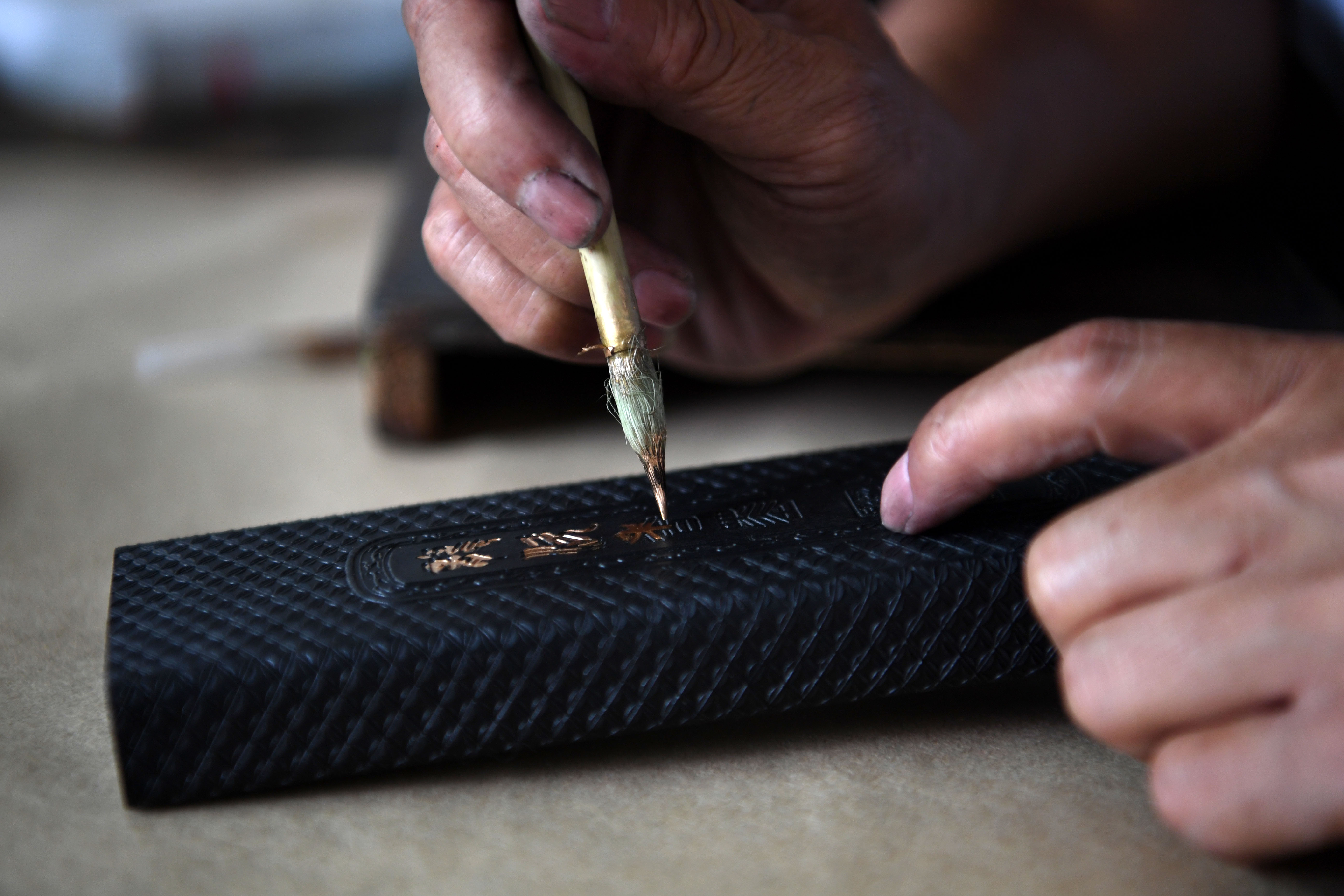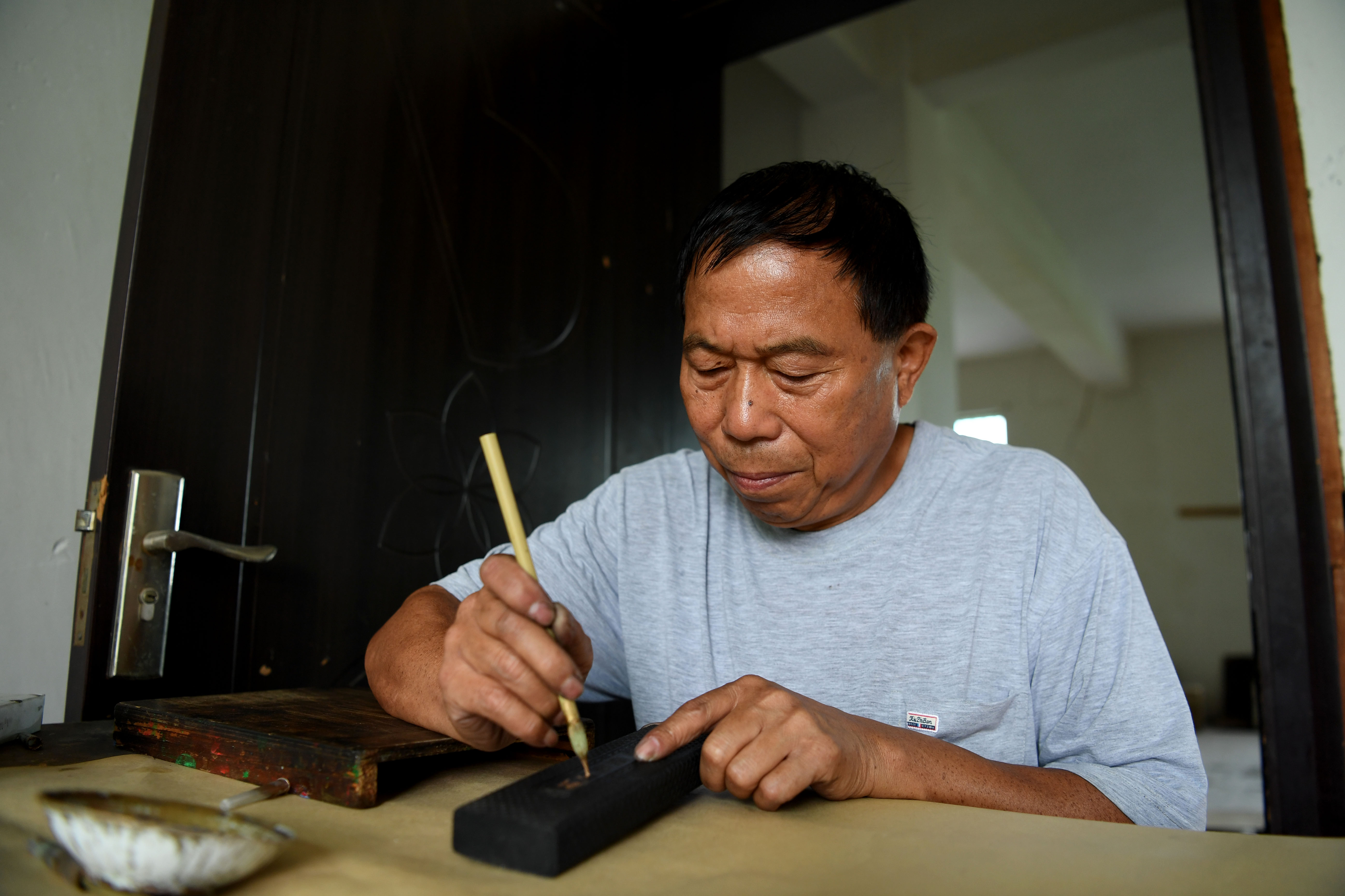 Wu Chenglin outlines design in gold on Huizhou inksticks in the Huizhou District of Huangshan, east China's Anhui Province, Aug. 29, 2019. (Xinhua/Liu Junxi)