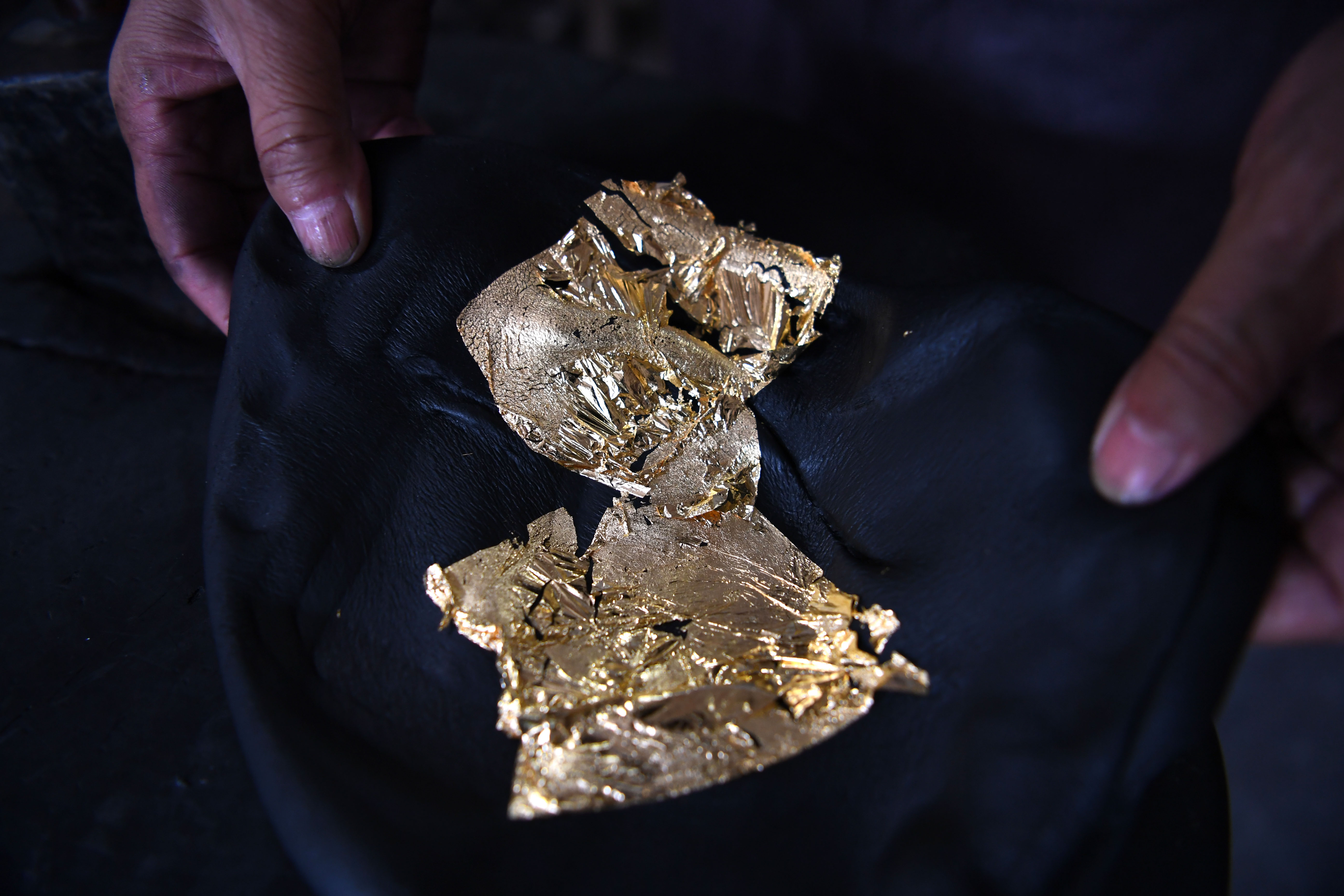 Wu Chenglin adds gold foil into ink materials in the Huizhou District of Huangshan, east China's Anhui Province, Aug. 29, 2019. (Xinhua/Liu Junxi)