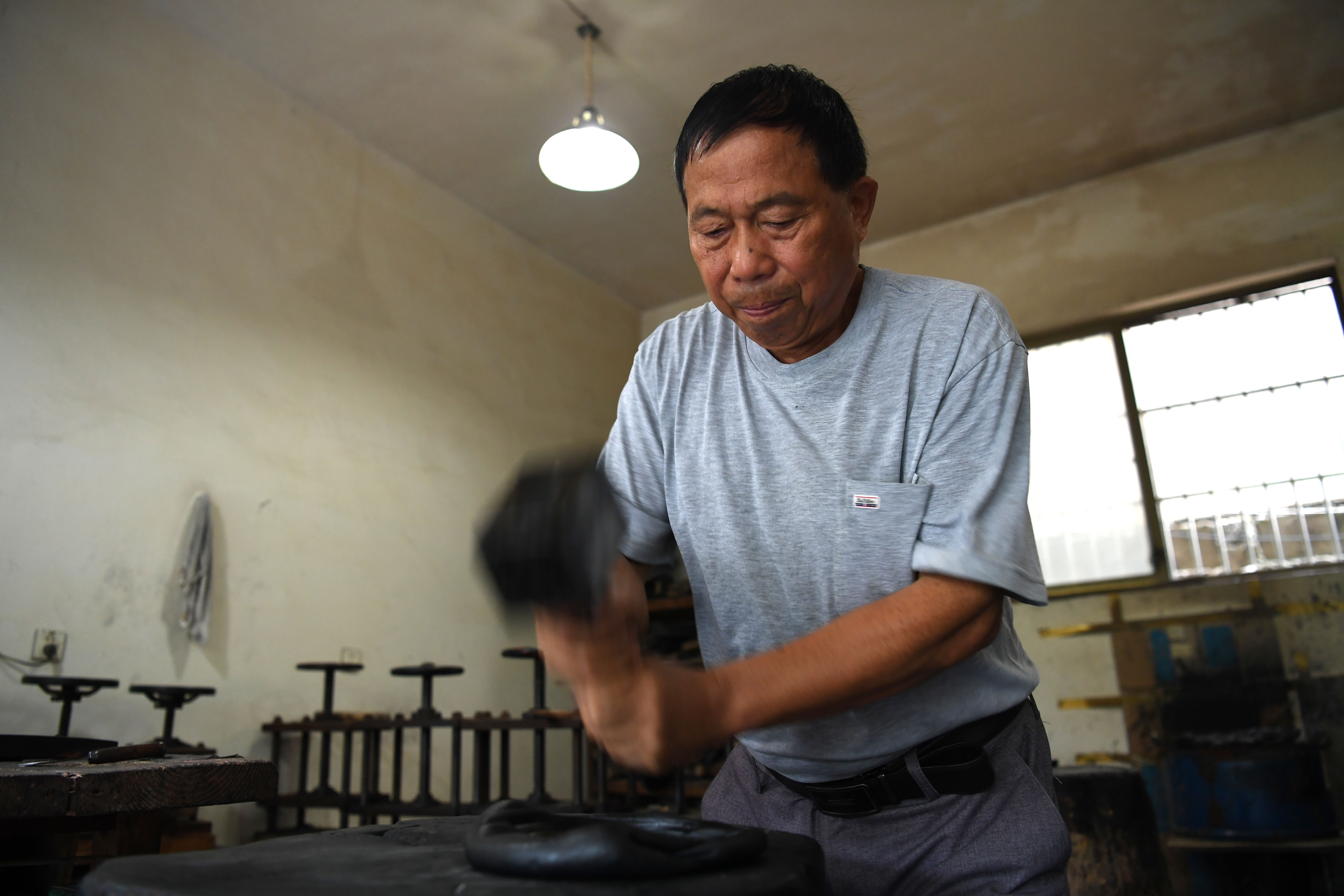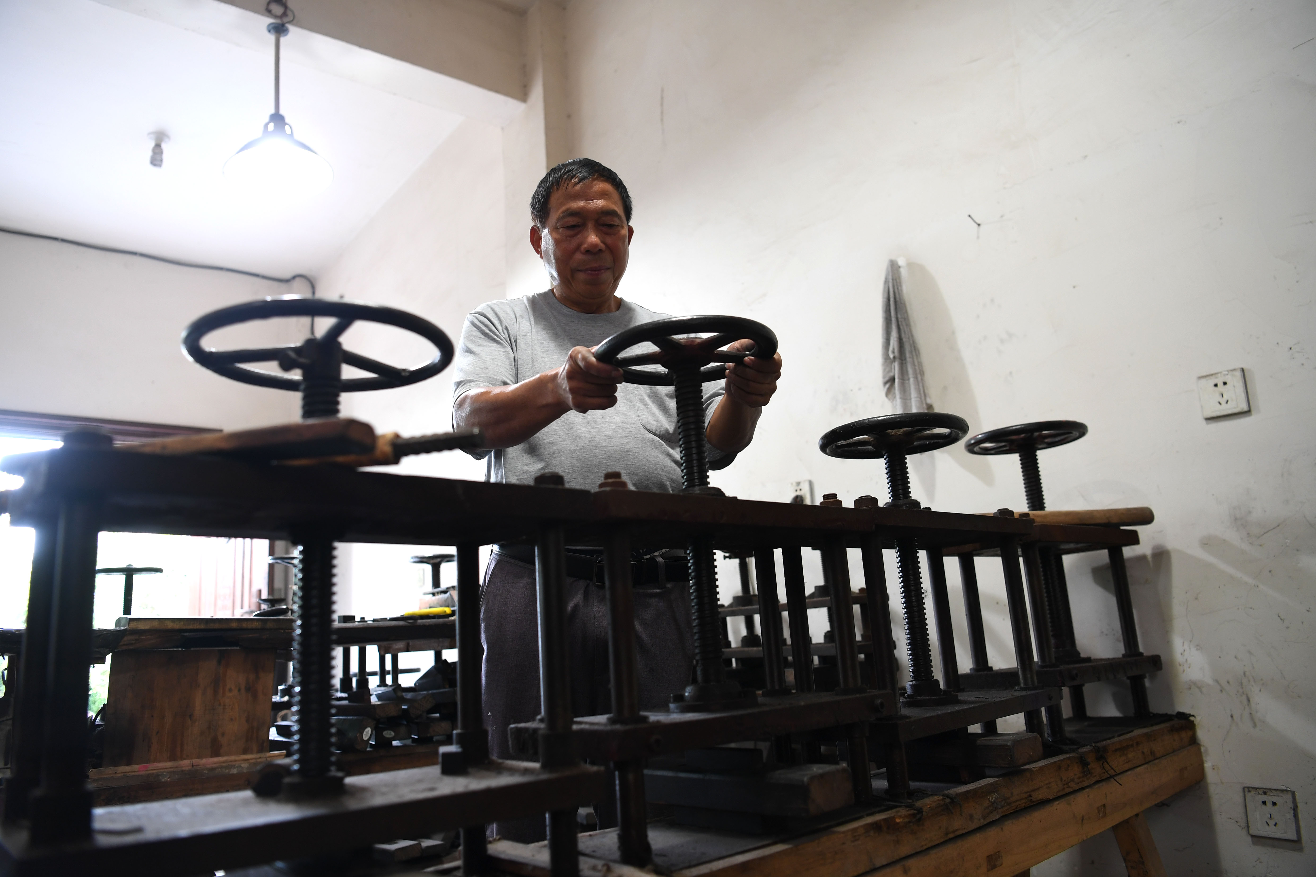 Wu Chenglin presses ink materials to make Huizhou inksticks in the Huizhou District of Huangshan, east China's Anhui Province, Aug. 29, 2019. (Xinhua/Liu Junxi)