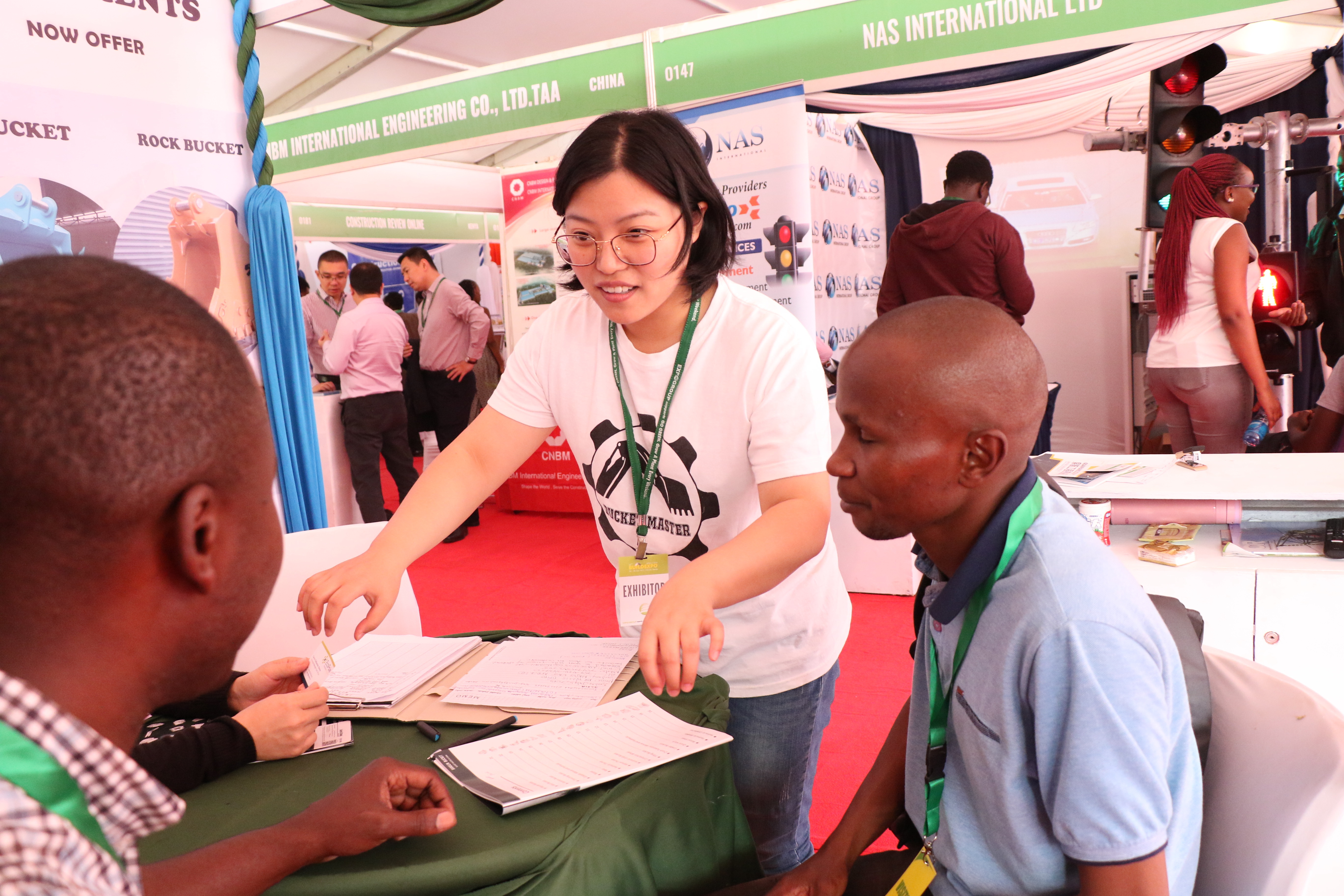 A Chinese saleswoman attends to customers during the annual Build Africa Expo 2019 at Kenyatta International Conference Center in Nairobi, capital of Kenya, July 5, 2019. Buildexpo Africa was an international platform for construction and building industry aiming at ensuring sustainable development. (Xinhua/Allan Mutiso)