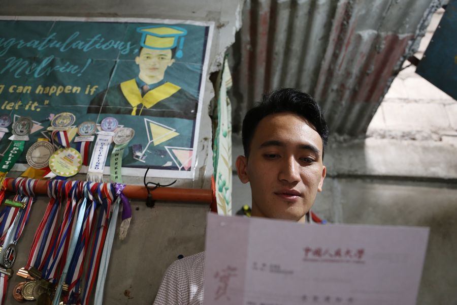 Melvin Chua reads his admission letter from the Renmin University of China in Manila, the Philippines, Aug. 31, 2019. (Xinhua/Yuan Mengchen)
