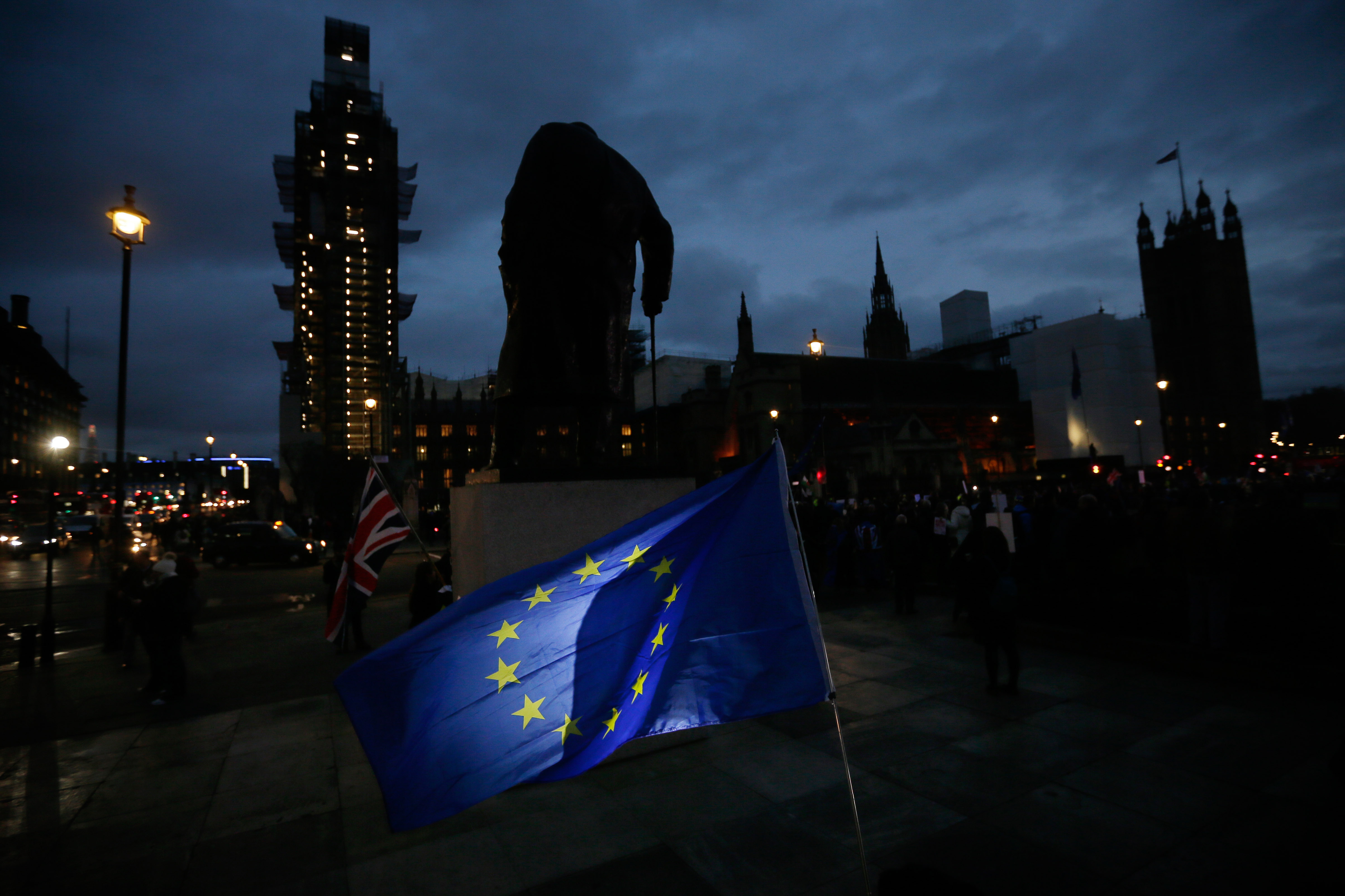 EU and UK flags are seen outside the Houses of Parliament, in front of a statue of Winston Churchill, in London, Britain on Jan. 15. 2019.(Xinhua/Tim Ireland)