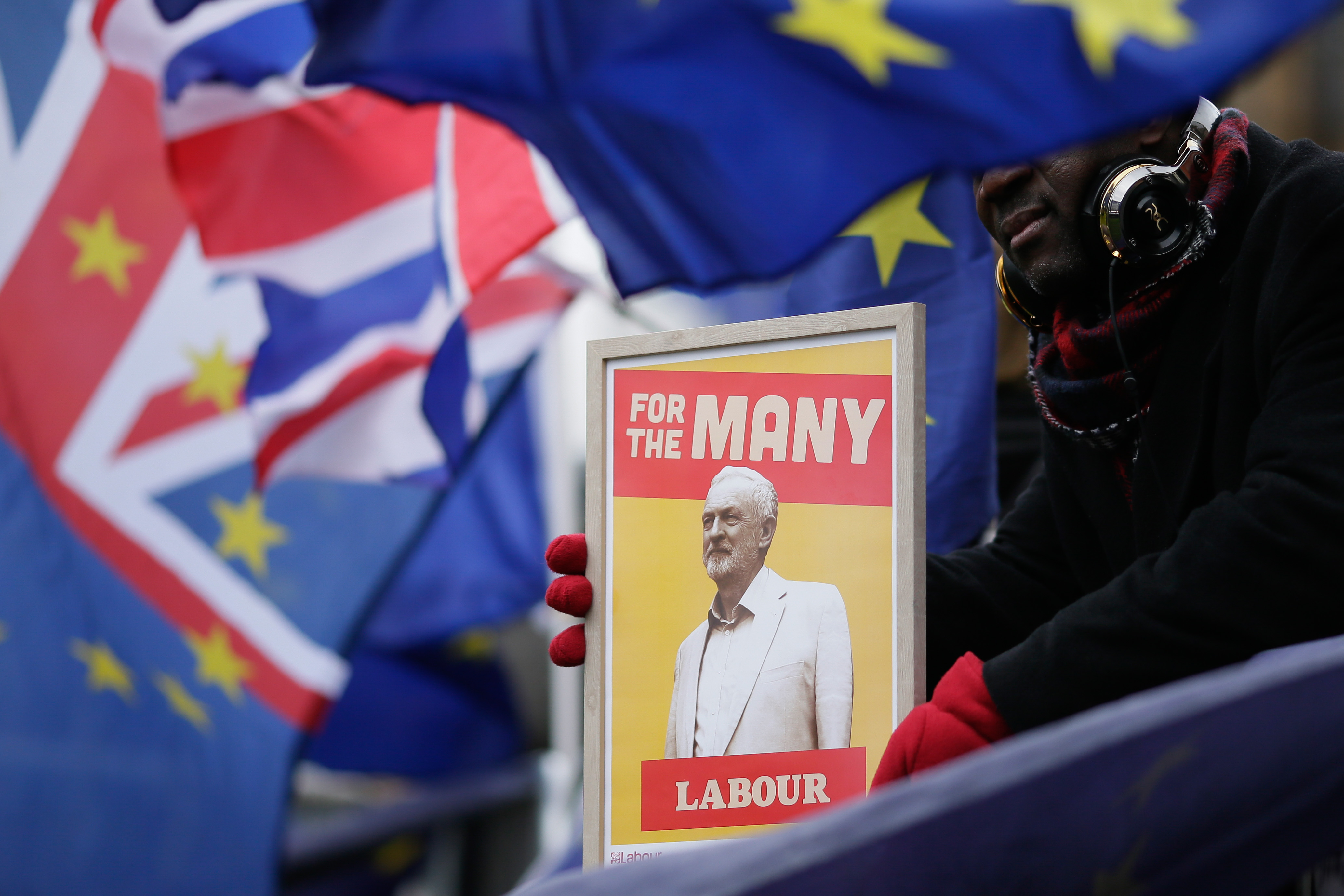 A demonstrator supporting British Labor party leader Jeremy Corbyn stands outside the Houses of Parliament in London, Britain, on Jan. 16, 2019.(Xinhua/Tim Ireland)