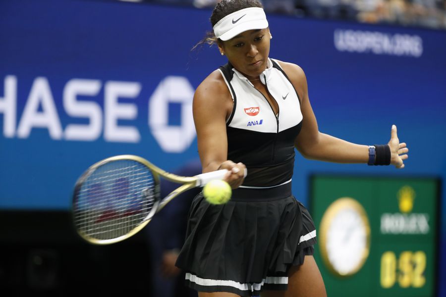 Naomi Osaka of Japan hits a return during the women's singles fourth round match against Belinda Bencic of Switzerland at the 2019 US Open in New York, the United States, on Sept. 2, 2019. (Xinhua/Li Muzi)