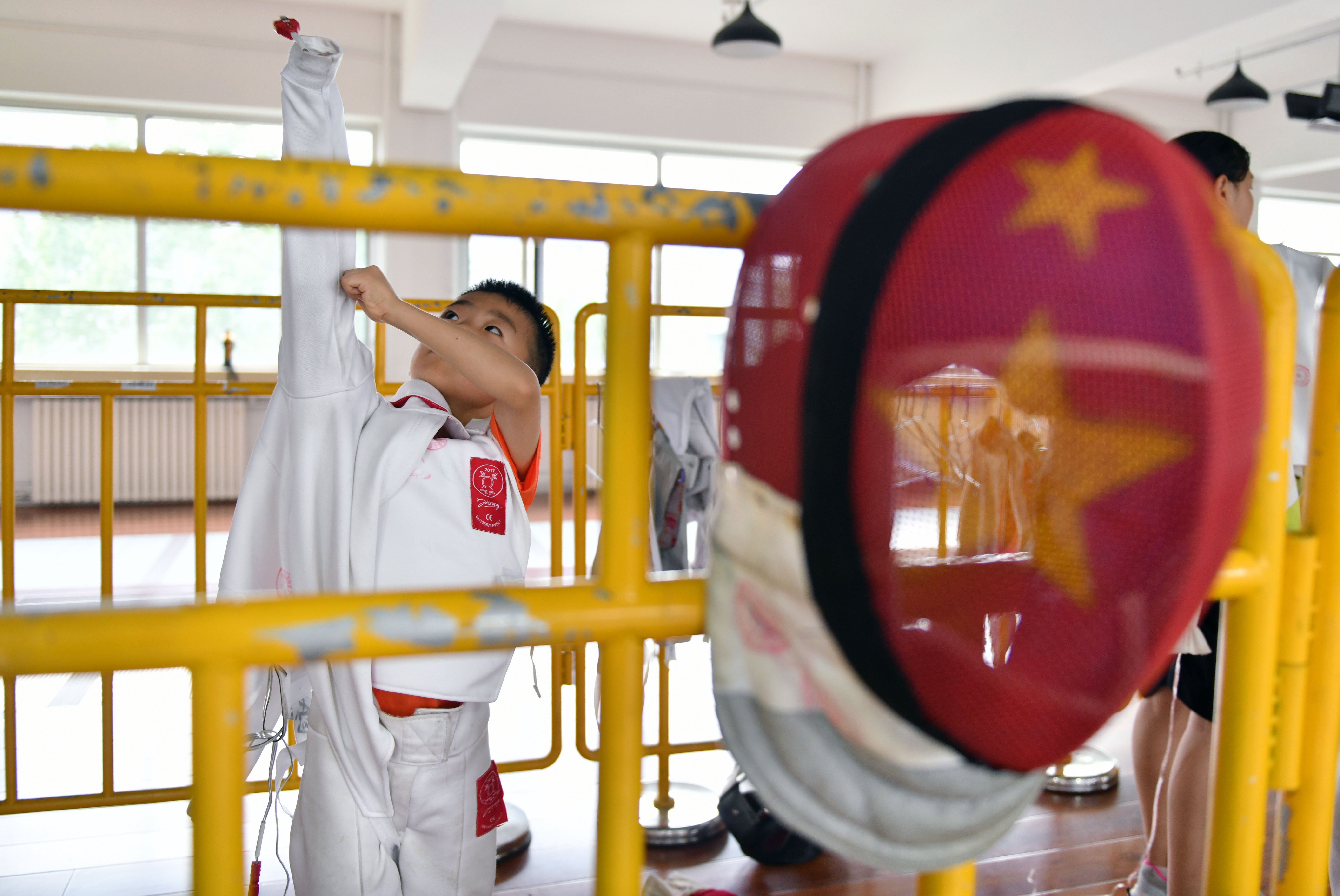 Zhang Yimeng attends his training session in a fencing club in Jinan, east China's Shandong Province. (Xinhua/Zhu Zheng)
