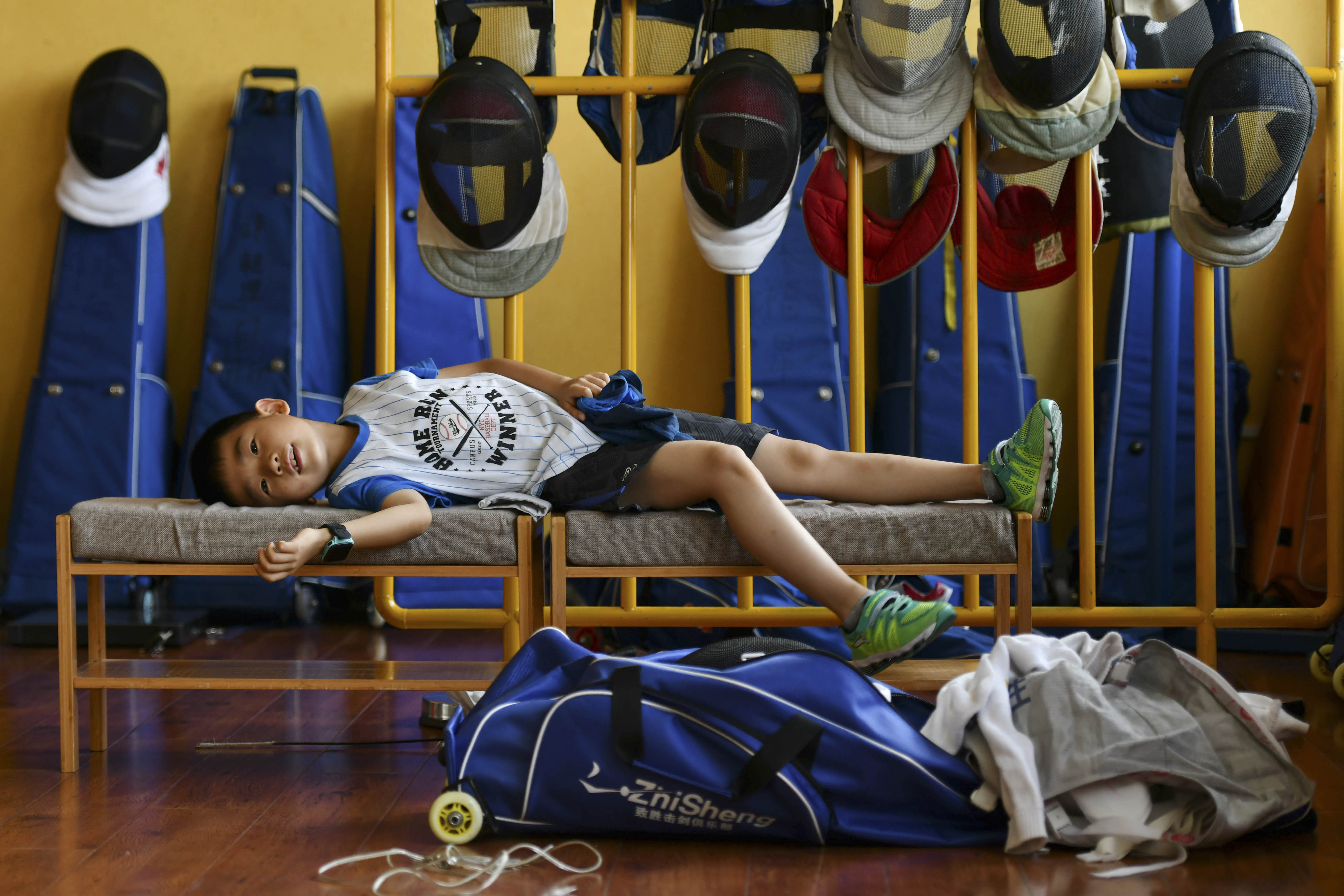 Zhang Yimeng lies on bench before his training session in a fencing club in Jinan, east China's Shandong Province. (Xinhua/Zhu Zheng)