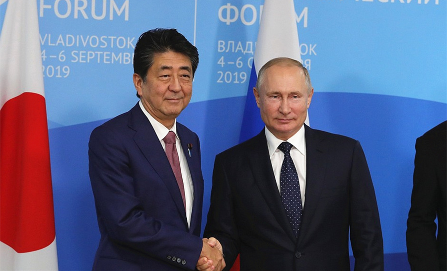 Russian President Vladimir Putin shakes hands with Japanese Prime Minister Shinzo Abe in Vladivostok, Russia, Sept. 5, 2019. (Kremlin Photo)