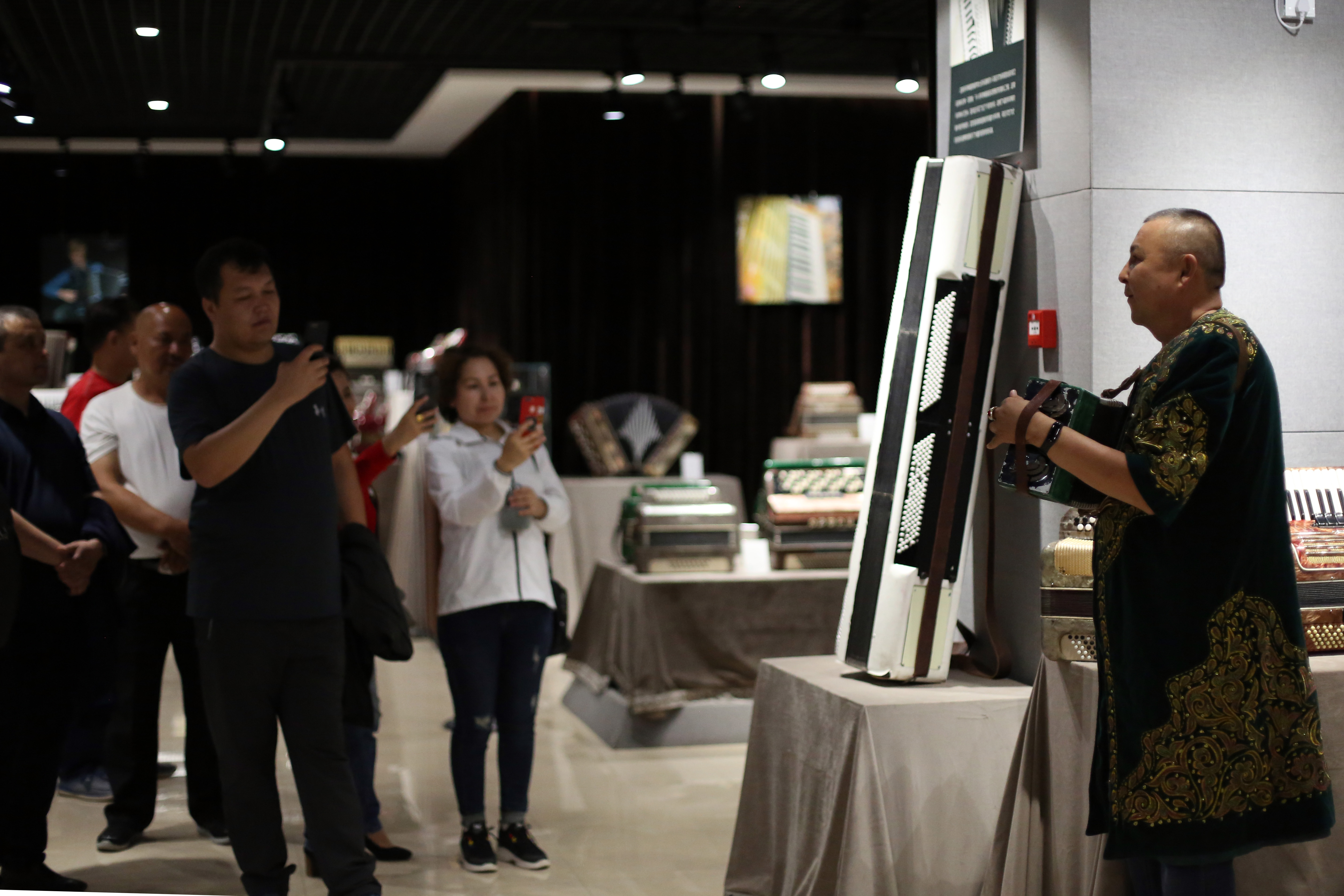 A visitor records a staff playing the accordion at the Tacheng accordion museum, Sept. 4, 2019. (Xinhua/Sadat)