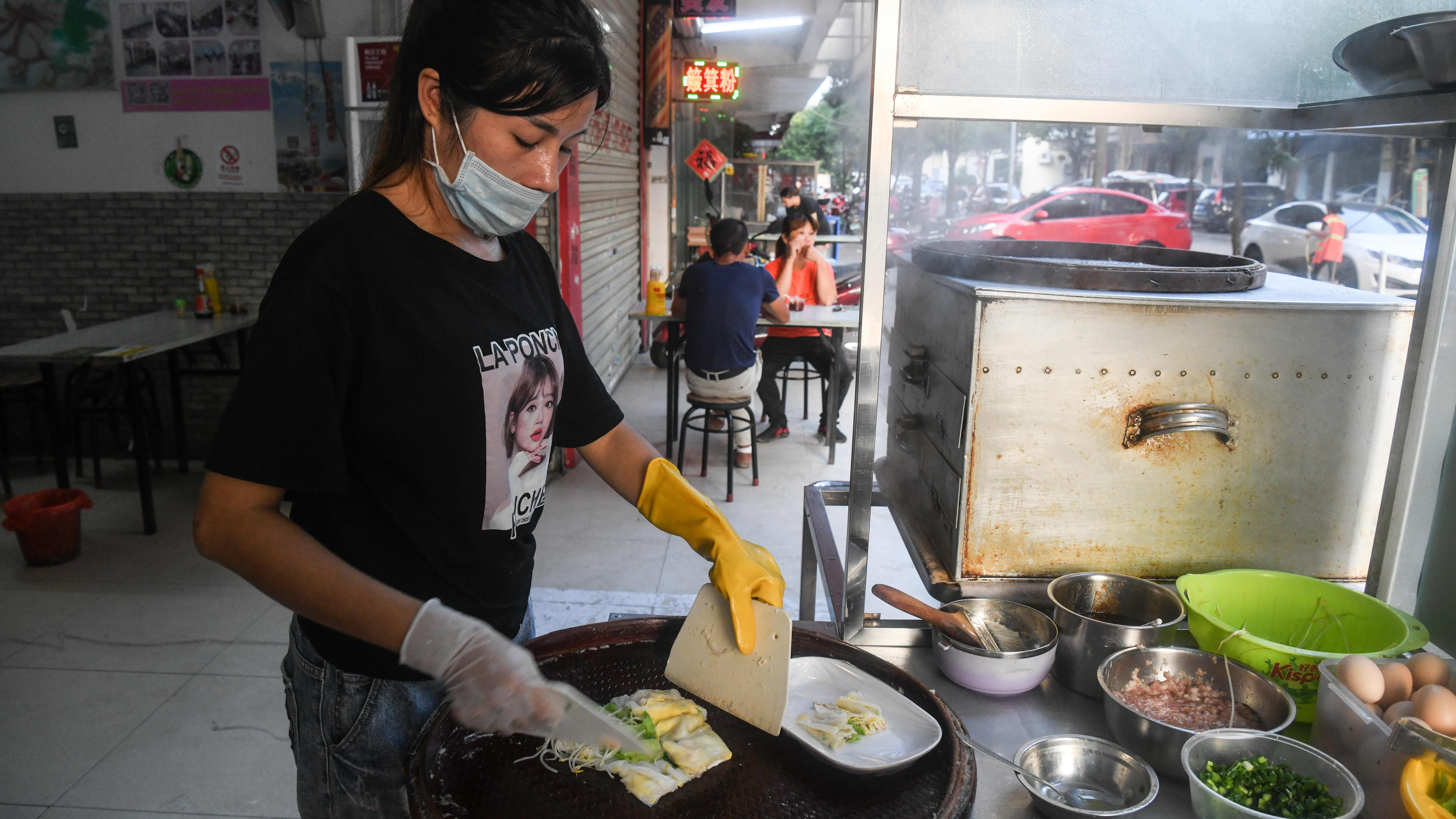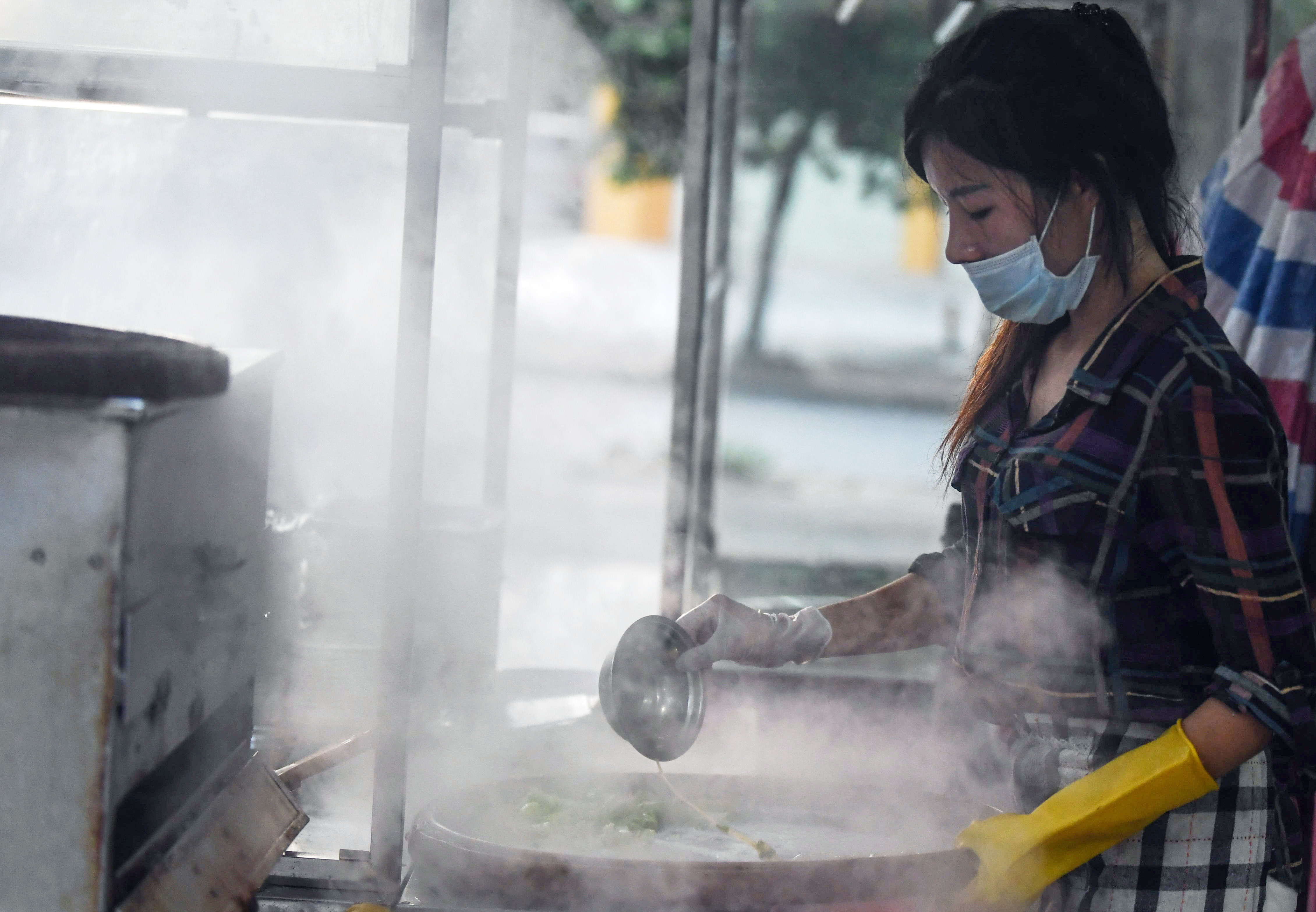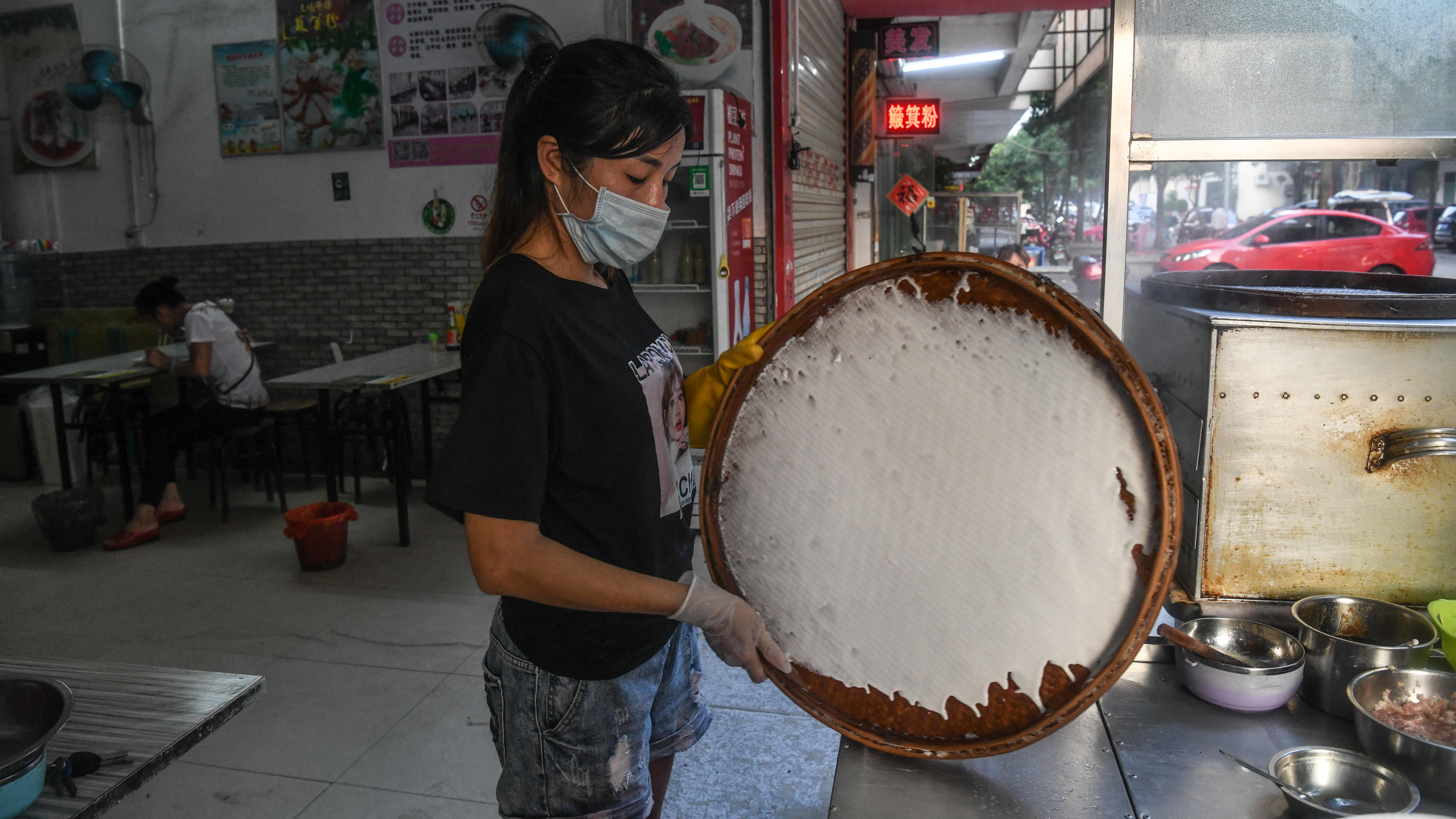 A woman makes "Bojifen", a kind of rice roll, at a snack bar in Qinzhou, south China's Guangxi Zhuang Autonomous Region, Sept. 8, 2019.(Xinhua/Zhang Ailin)
