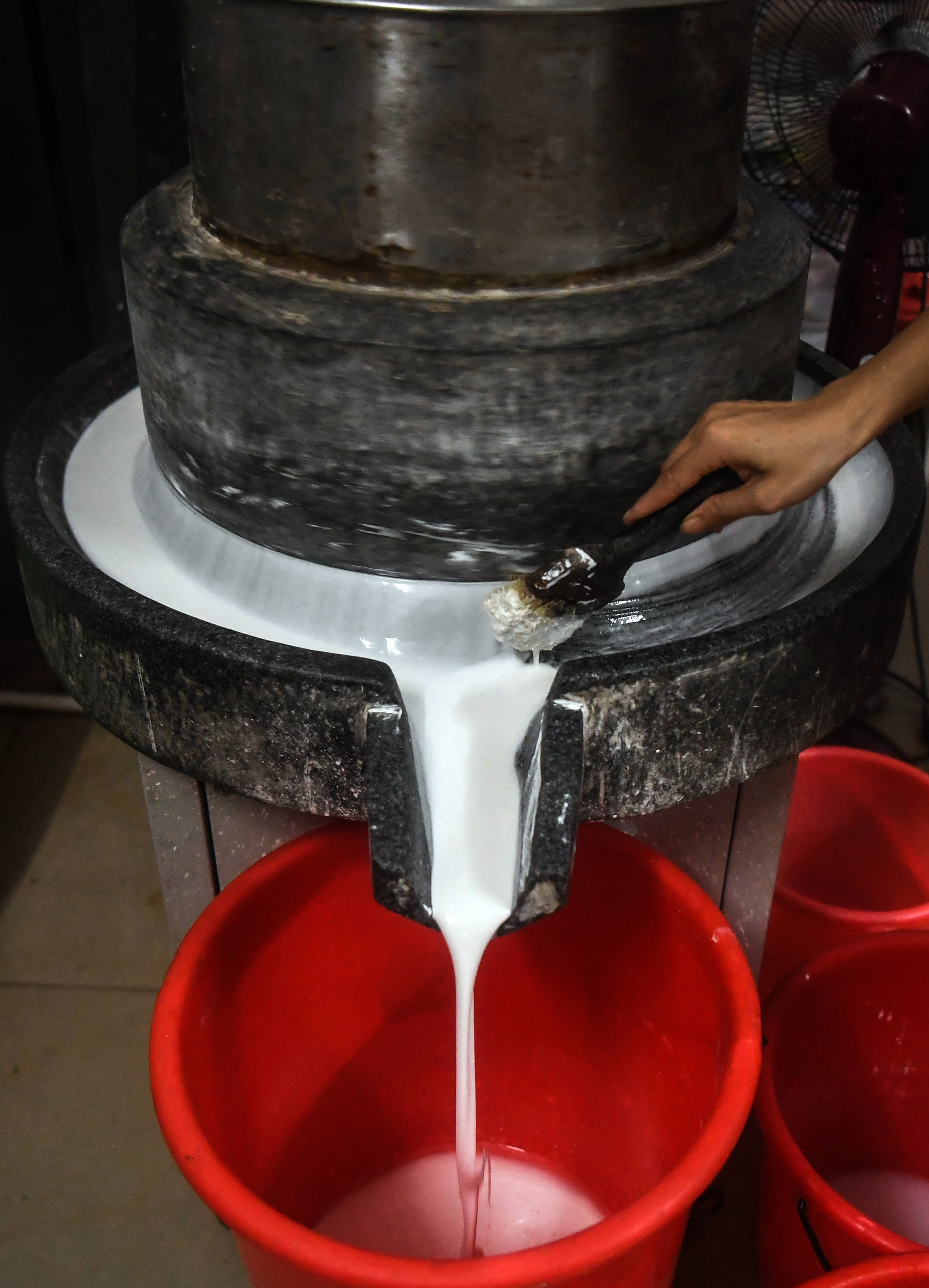 A staff grinds rice milk used to make "Bojifen", a kind of rice roll, at a snack bar in Qinzhou, south China's Guangxi Zhuang Autonomous Region, Sept. 6, 2019. (Xinhua/Zhang Ailin)
