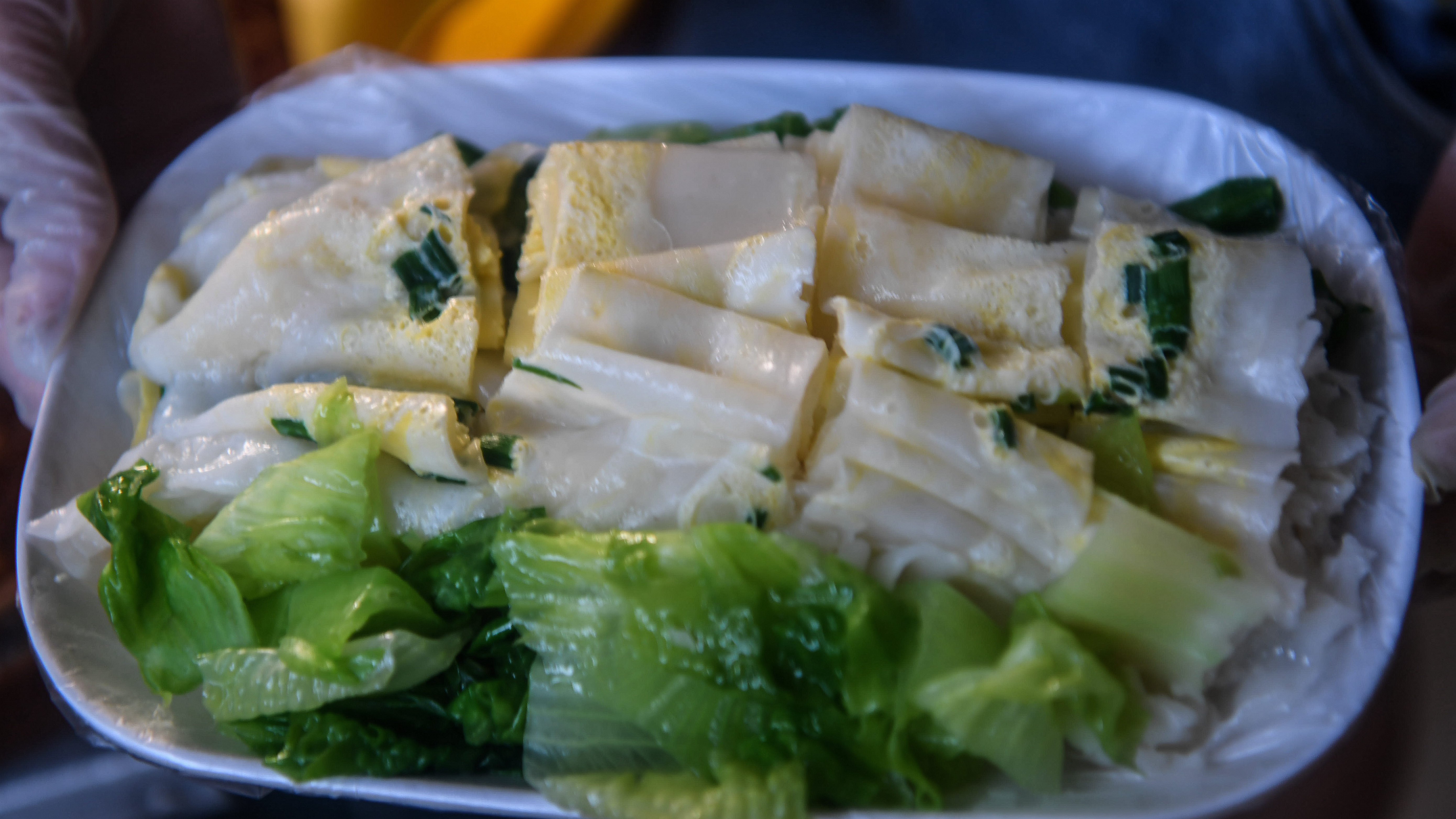 The process of making "Bojifen" is quite simple. Pour the rice milk into a winnowing fan and then steam it for a while. Use a bamboo sheet to peel the steamed rice milk from the winnowing fan and roll it. Pork or egg can be added to it according to customer's request.