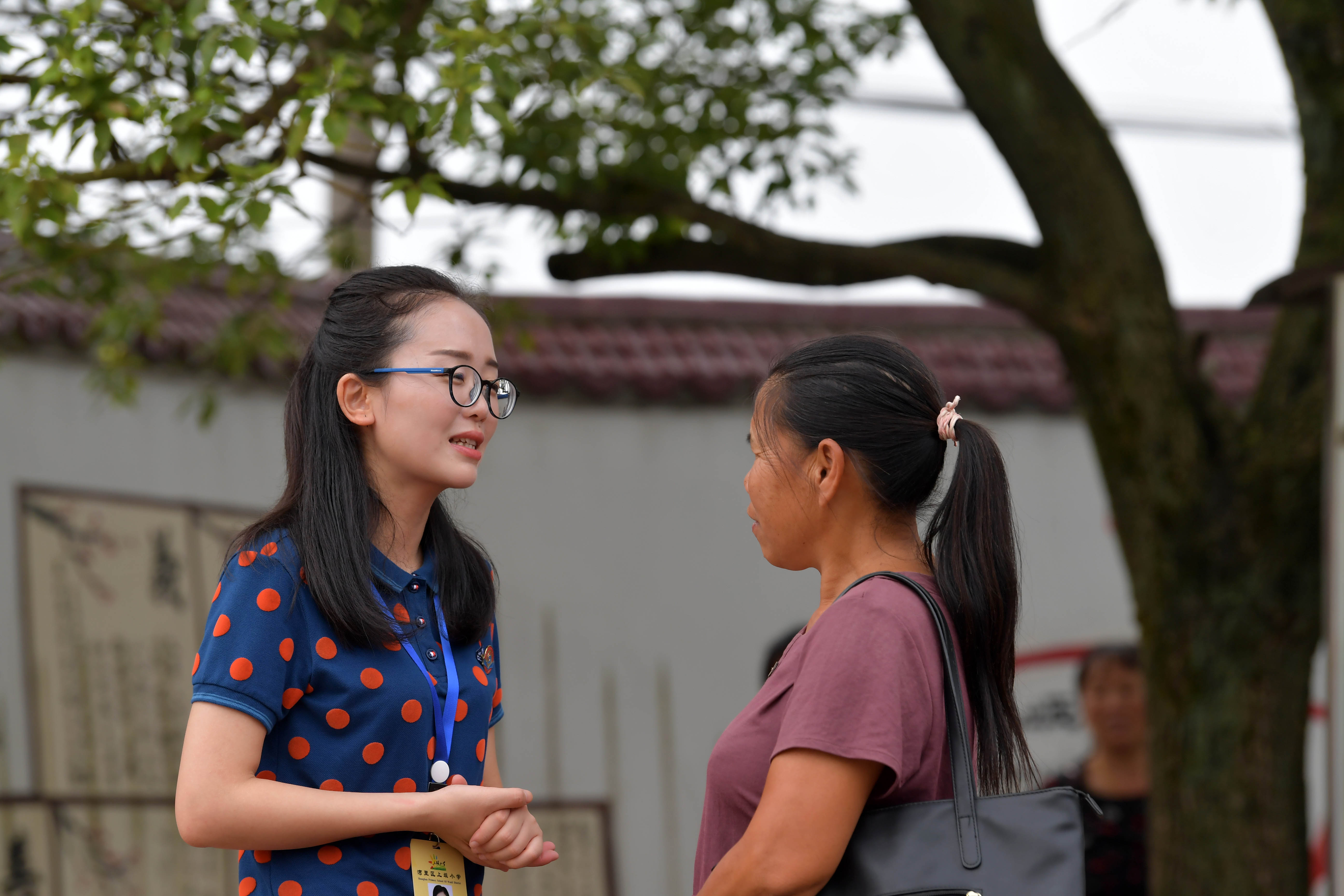 Tu Youyou (L) talks with a mother about her child's performance on holiday at Shangban primary school in Luoting Township, Wanli District of Nanchang City, east China's Jiangxi Province, Sept. 1, 2019. (Xinhua/Peng Zhaozhi)