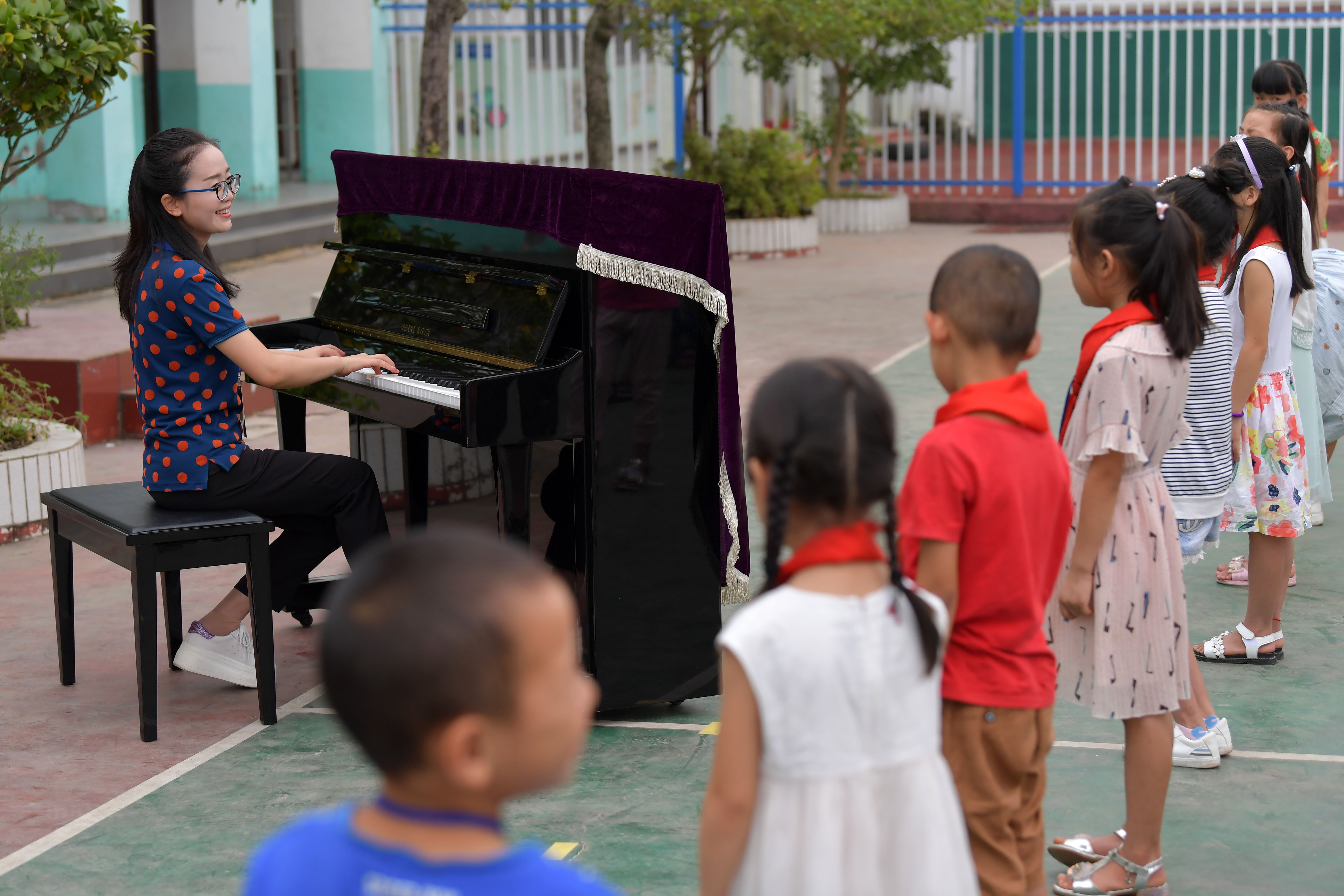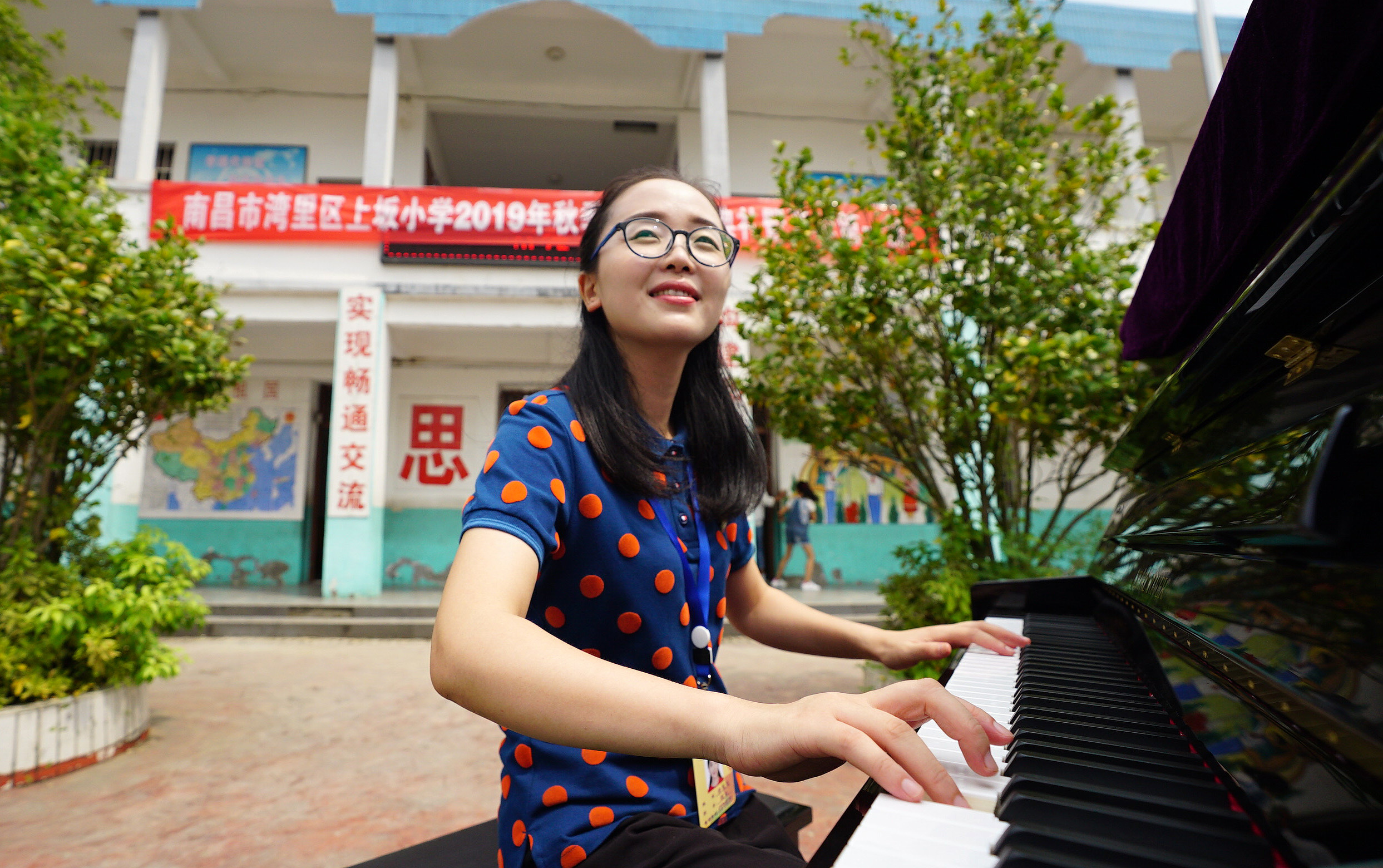 Tu Youyou plays the piano to welcome students at Shangban primary school in Luoting Township, Wanli District of Nanchang City, east China's Jiangxi Province, Sept. 1, 2019. (Xinhua/Peng Zhaozhi)