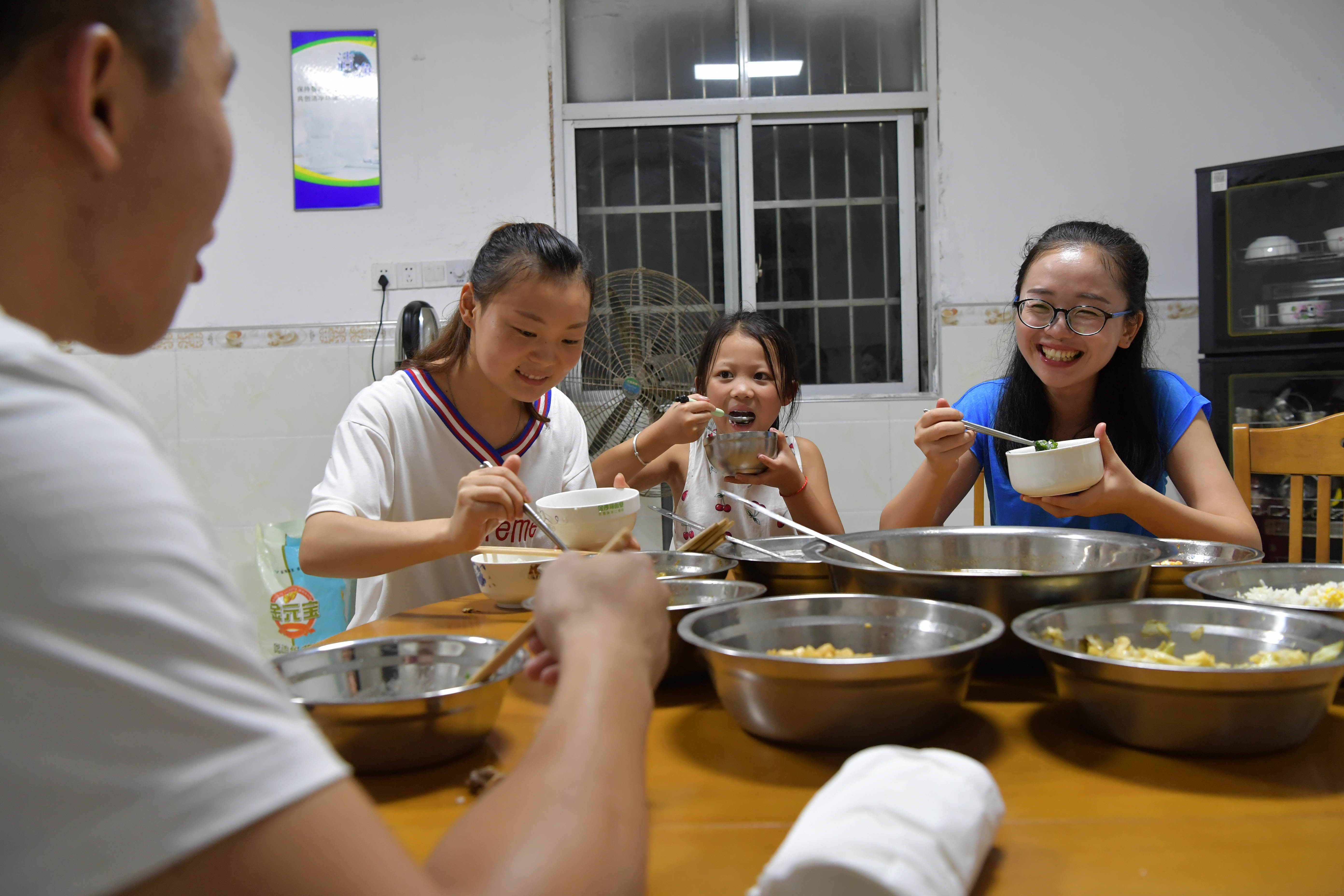 Tu Youyou (1st R) has dinner with teachers and students at Shangban primary school in Luoting Township, Wanli District of Nanchang City, east China's Jiangxi Province, Sept. 2, 2019. (Xinhua/Peng Zhaozhi)