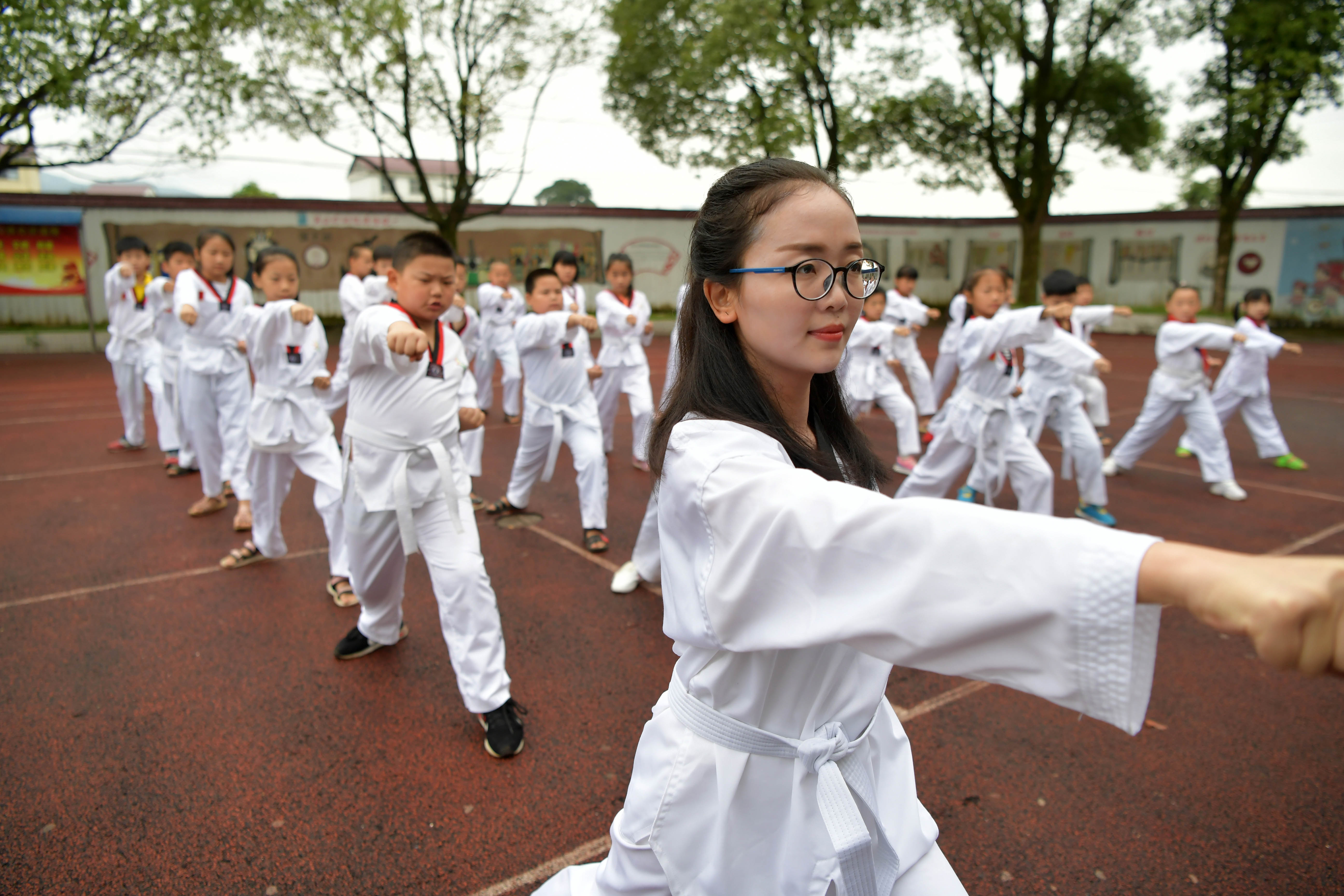 Tu Youyou (front) teaches students taekwondo at Shangban primary school in Luoting Township, Wanli District of Nanchang City, east China's Jiangxi Province, Sept. 2, 2019. (Xinhua/Peng Zhaozhi)