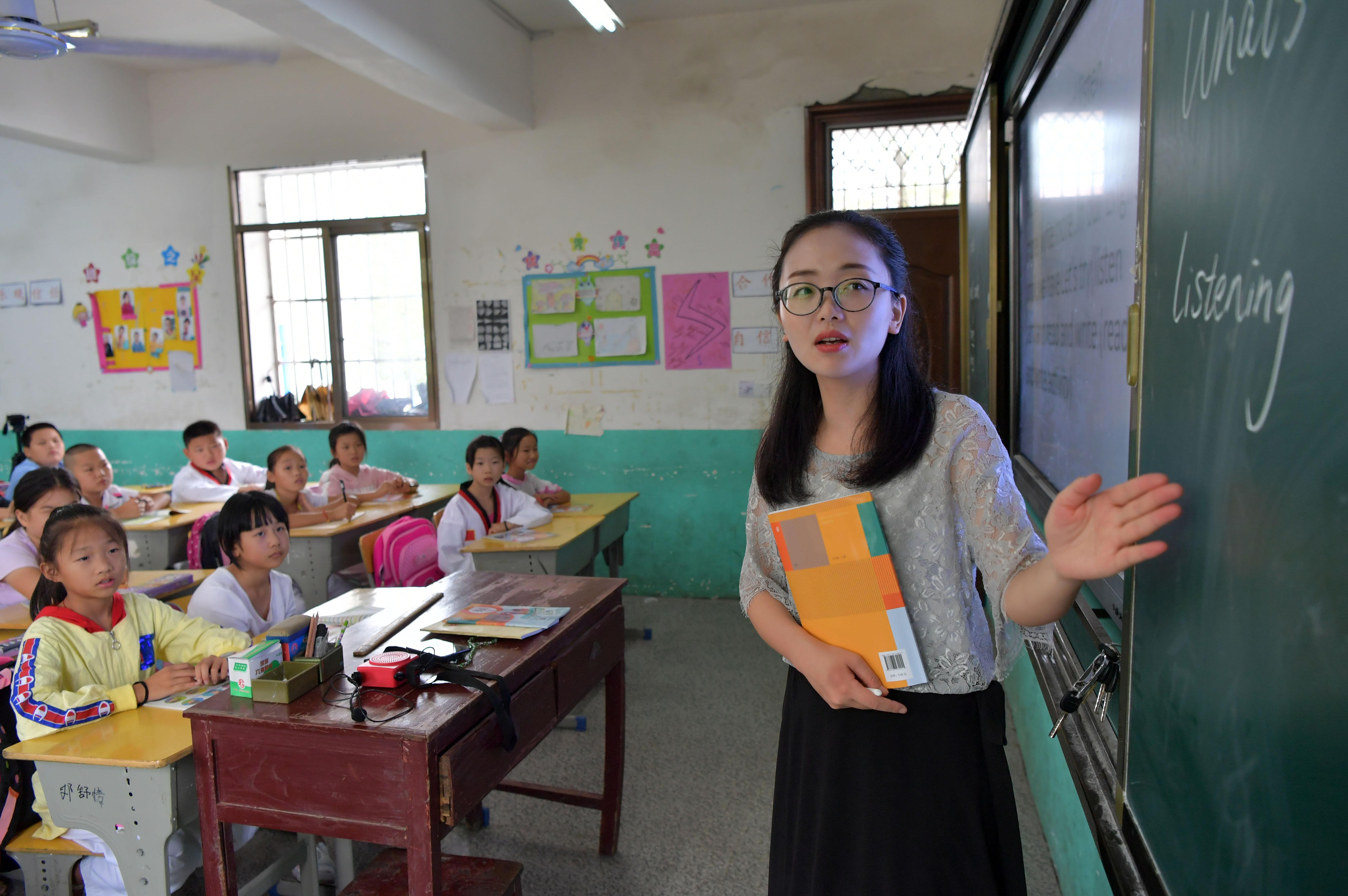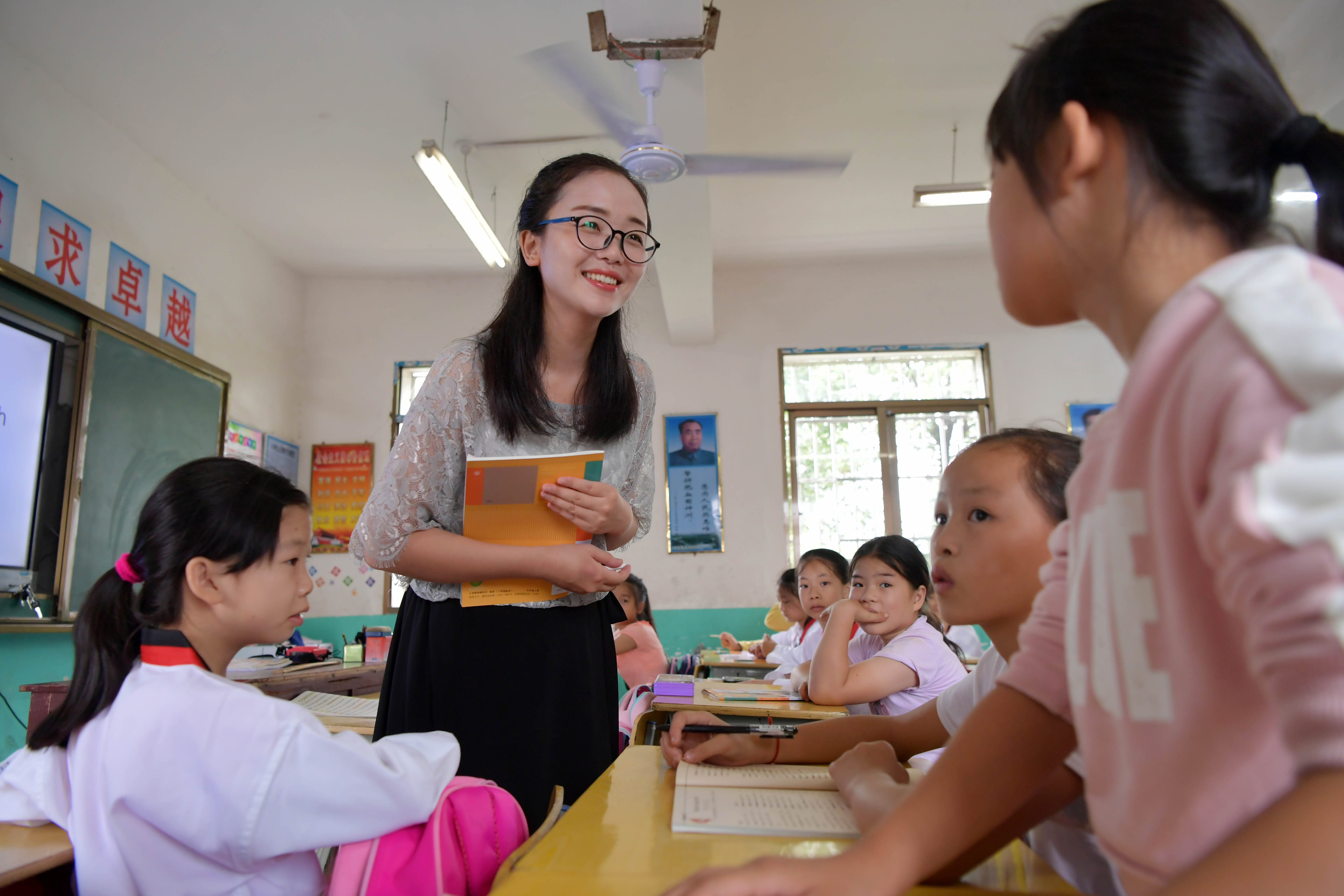 Tu Youyou (1st R) gives an English lesson at Shangban primary school in Luoting Township, Wanli District of Nanchang City, east China's Jiangxi Province, Sept. 2, 2019. (Xinhua/Peng Zhaozhi)