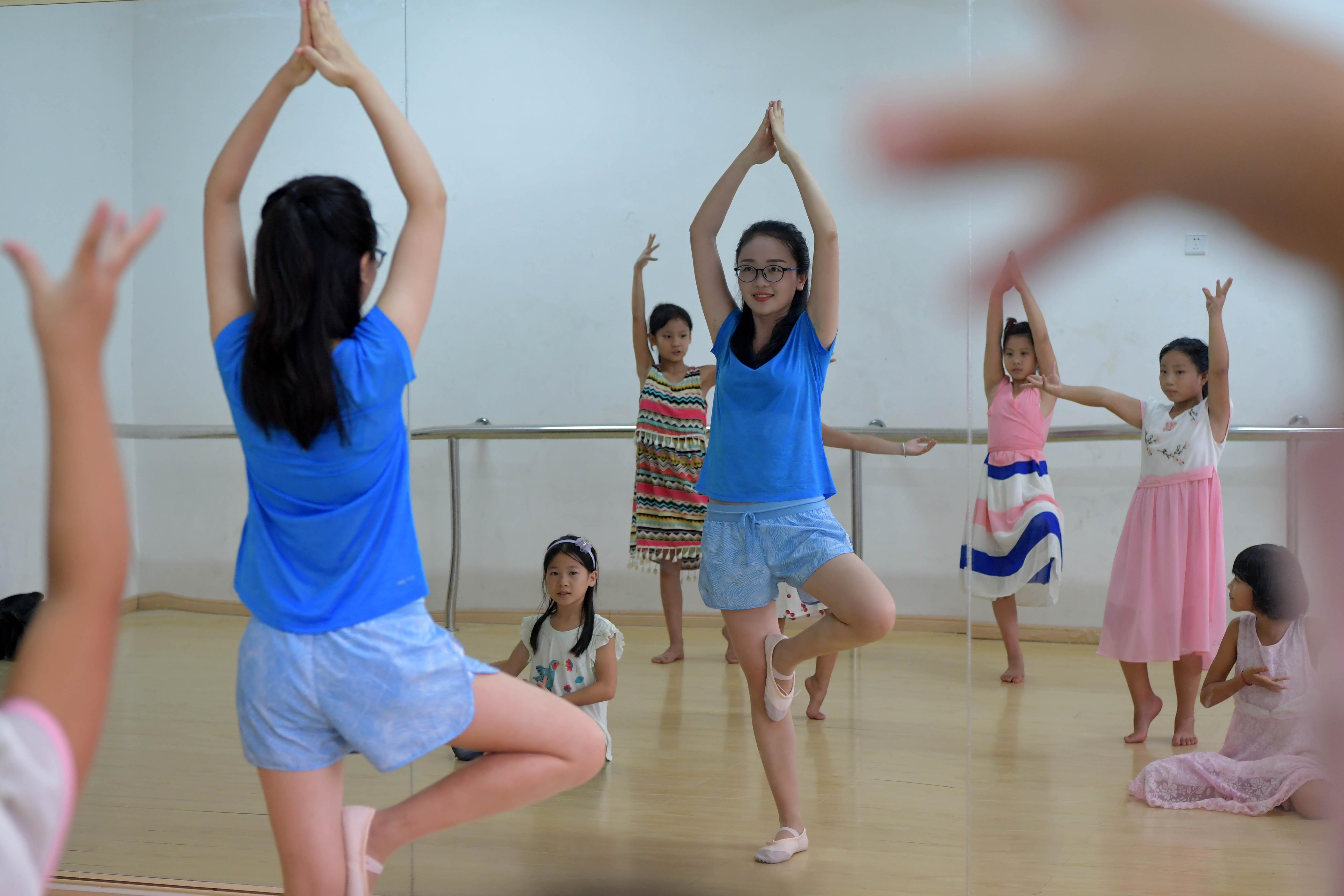 Principal Tu Youyou (2nd L) instructs pupils in dance at Shangban primary school in Luoting Township, Wanli District of Nanchang City, east China's Jiangxi Province, Sept. 2, 2019. (Xinhua/Peng Zhaozhi)