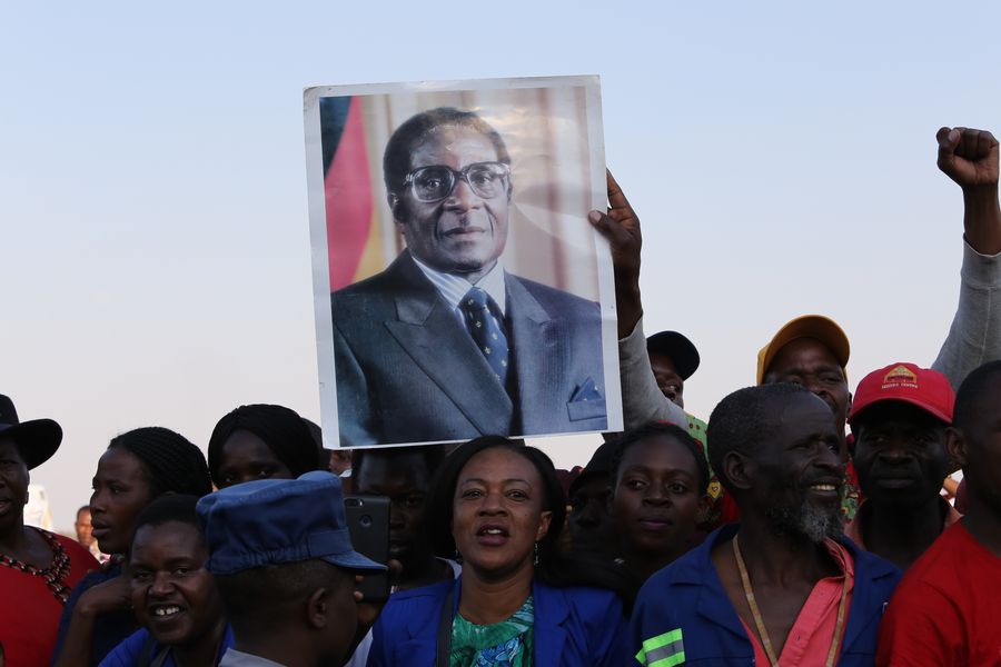 Zimbabweans receive the body of the late former Zimbabwean President Robert Mugabe at the Robert Gabriel Mugabe International Airport in Harare, Zimbabwe, on Sept. 11, 2019. The body of the late former Zimbabwean President Robert Mugabe, who died in Singapore last Friday aged 95, arrived in the country on Wednesday afternoon ahead of his burial planned for Sunday. (Xinhua/Chen Yaqin)