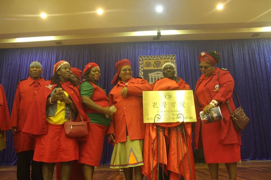 South African traditional healers pose for a group photo during the unveiling of the Confucius Institute for Traditional Chinese Medicine at the University of the Western Cape in Bellville, Western Cape, South Africa, Sept. 11, 2019. (Xinhua/William Muvi)